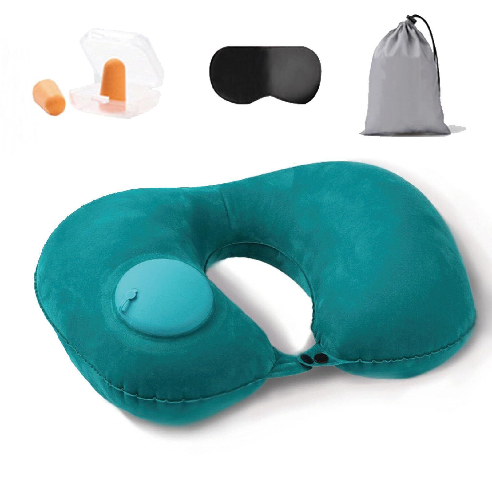 ネックピロー U型 ベルベット 手動プッシュ式充気 収納袋、アイマスク、耳栓付き 5色対応 ポータブル 飛行機 バス 短時間休憩 自宅 電車 オフィス 旅行 便利グッズ (グリーン)