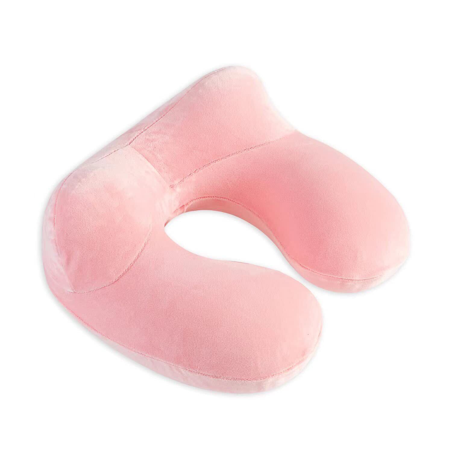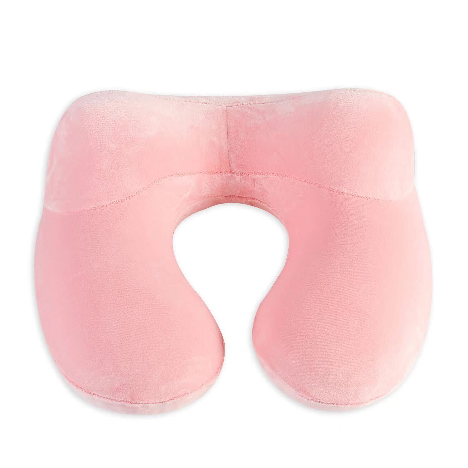 空気注入式トラベルピロー - 100%ソフトベルベットネックサポート 旅行、飛行機、電車、車、オフィス用 コンパクトなキャリーバッグ付き 通気性があり洗濯可能なカバー 大人が眠る方に最適 - ピンク