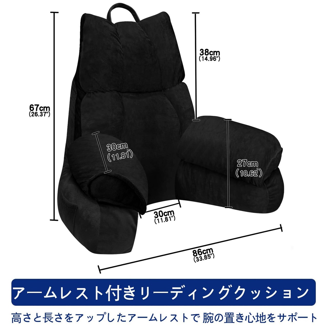 【2025最新】背もたれ クッション,アームレスト付き読書枕 大人向けサポートピロー,ベッド&ソファ用 テレビ枕・ゲームやリラックスに最適なリーディングクッション(くろ,67*30cm)