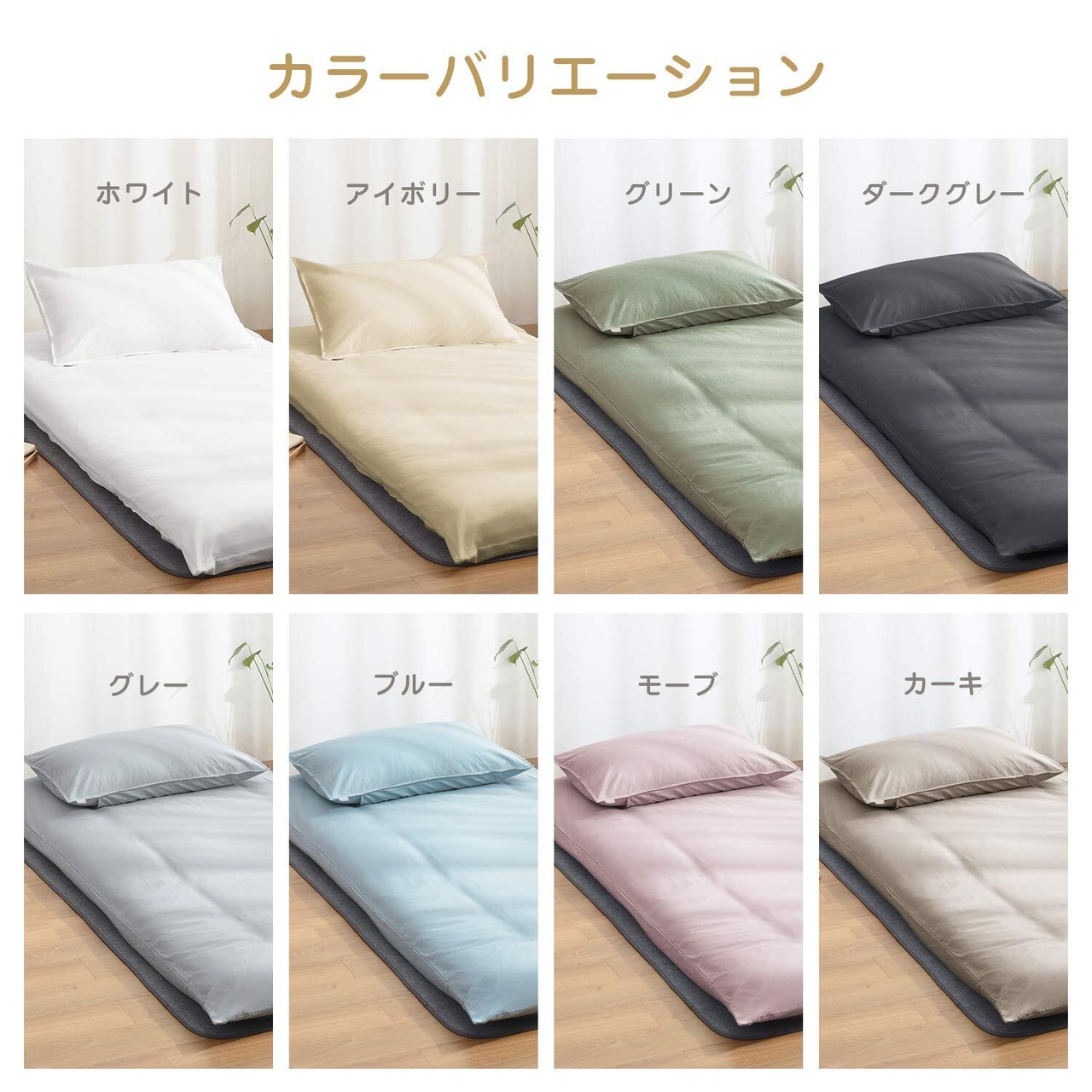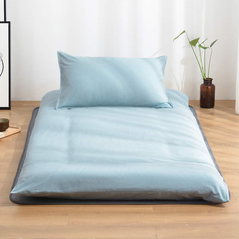 <ご注意>:写真中展示されている「枕カバー」と布団の下に敷いている「除湿シート」は、当店で別売りとなっております。