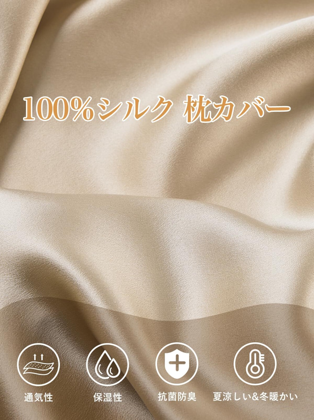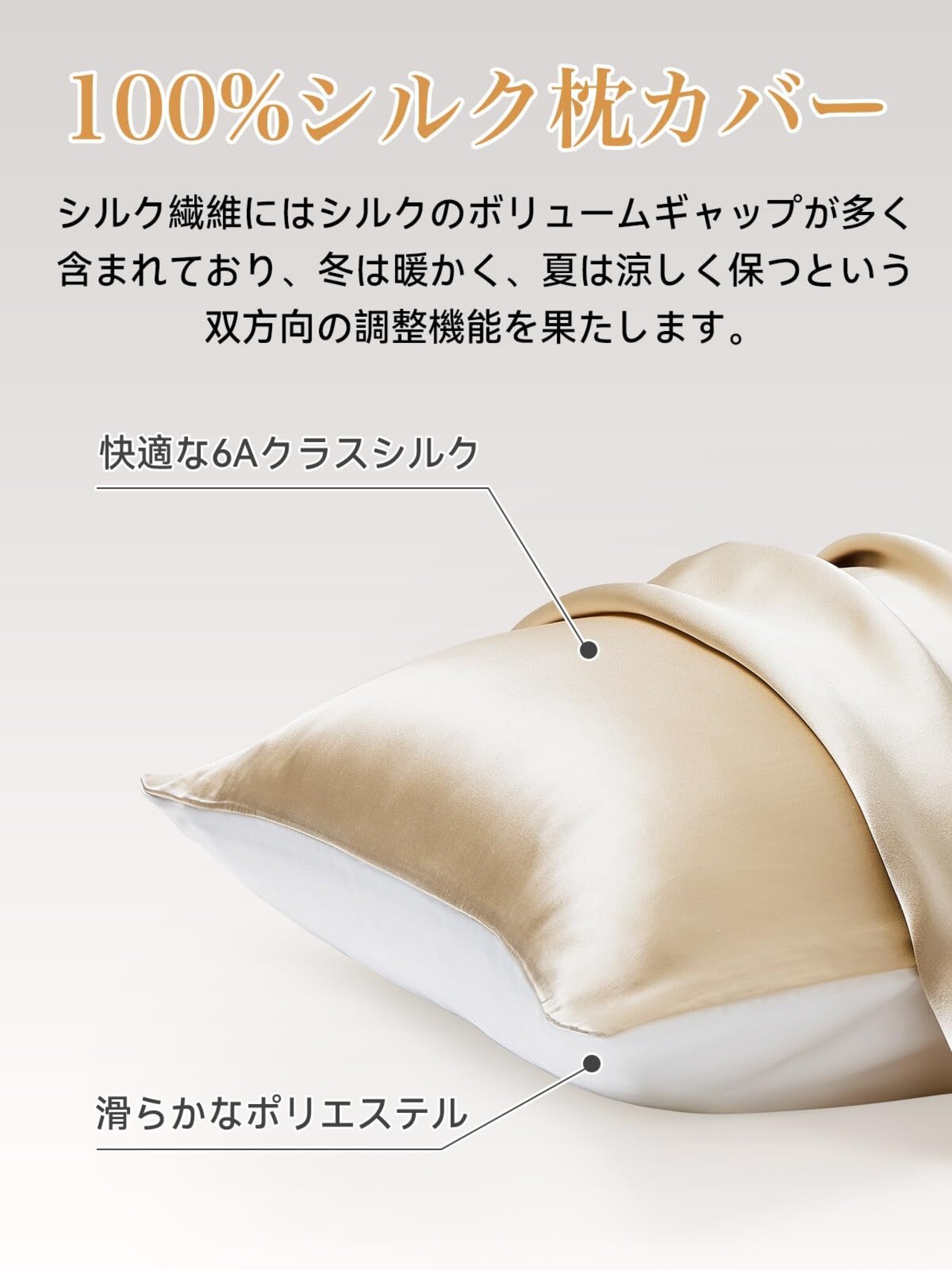 【美肌の秘訣・柔らかく滑らかな肌触り】シルクは約18種類のアミノ酸からなる繊維で、その主成分は人間の皮膚と同じ組成のタンパク質である。そのため、シルクは肌との親和性が高く、アレルギーを起こしにくいのです。シルクの枕カバーを定期的に使用すると、肌の弾力性が高まり、小じわの発生が遅くなり、肌が滑らかでしっとりします。また、シルクは雑菌やダニが繁殖しにくく、汗を吸収すると同時に消臭効果もあるため、真菌感染によるニキビから肌を守ることがでます。
