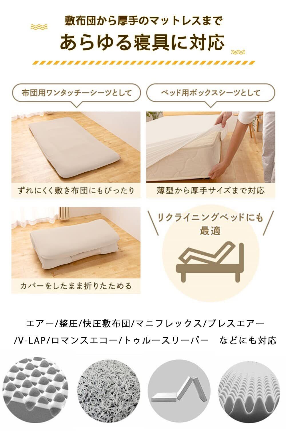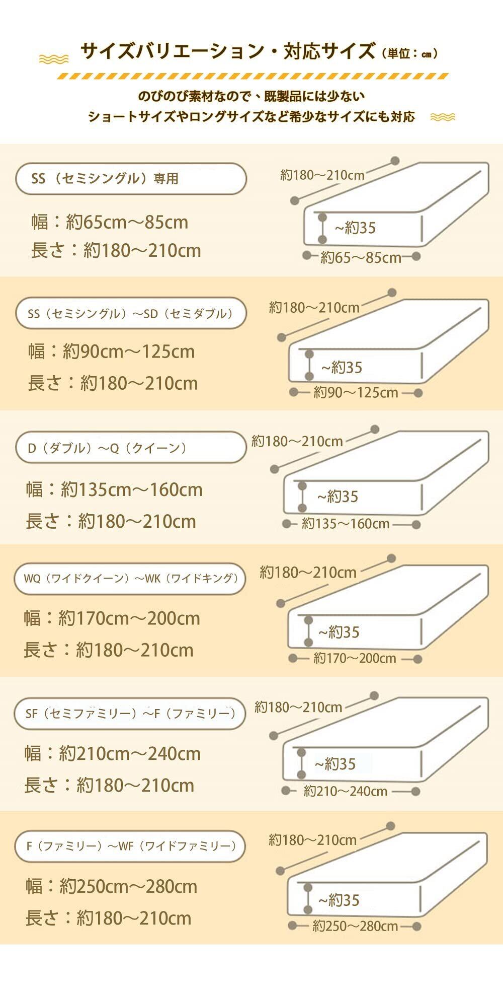 【対応サイズ】170cm~200cm(幅)x180cm~210cm(縦)x35cmまで(マチ)・ワイドクイーン、キング、ワイドキング3人用 対応ボックスタイプのびるシーツ。【本体サイズ】165x180x32cm