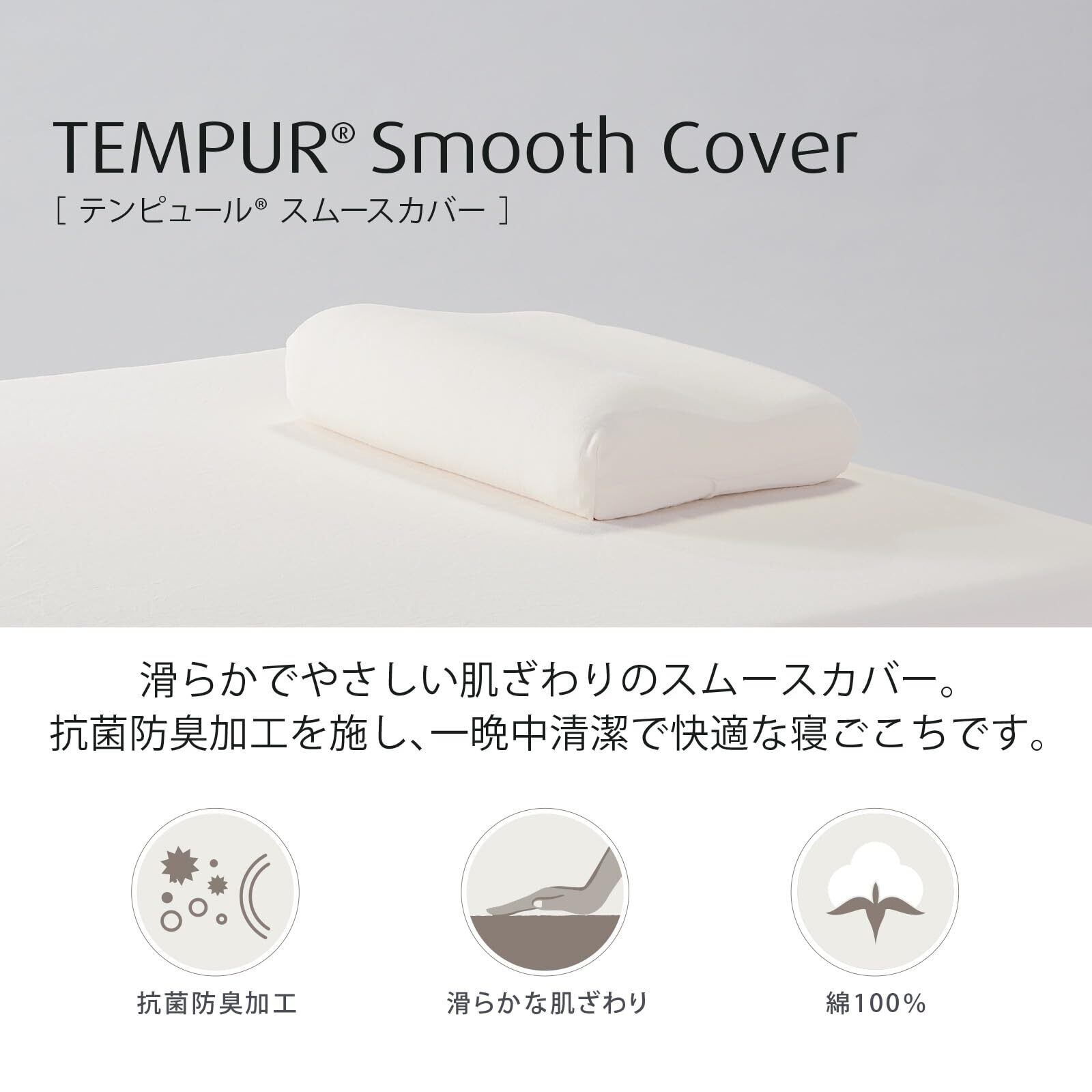 滑らかでやさしい肌ざわりのスムースカバー。抗菌防臭加工を施し、一晩中清潔で快適な寝ごこちです。良質の綿をストレッチ性のあるスムース編みで仕上げました。