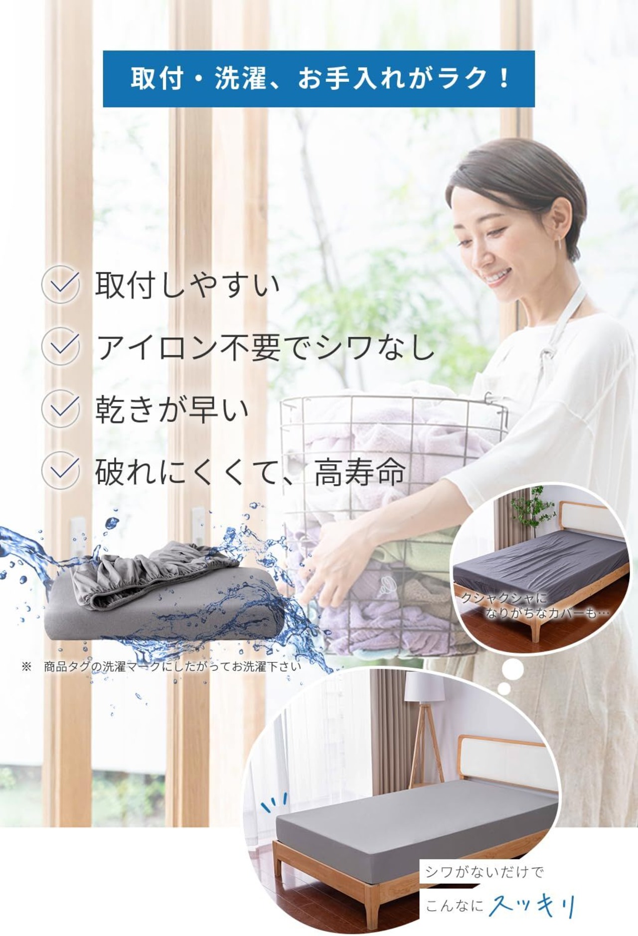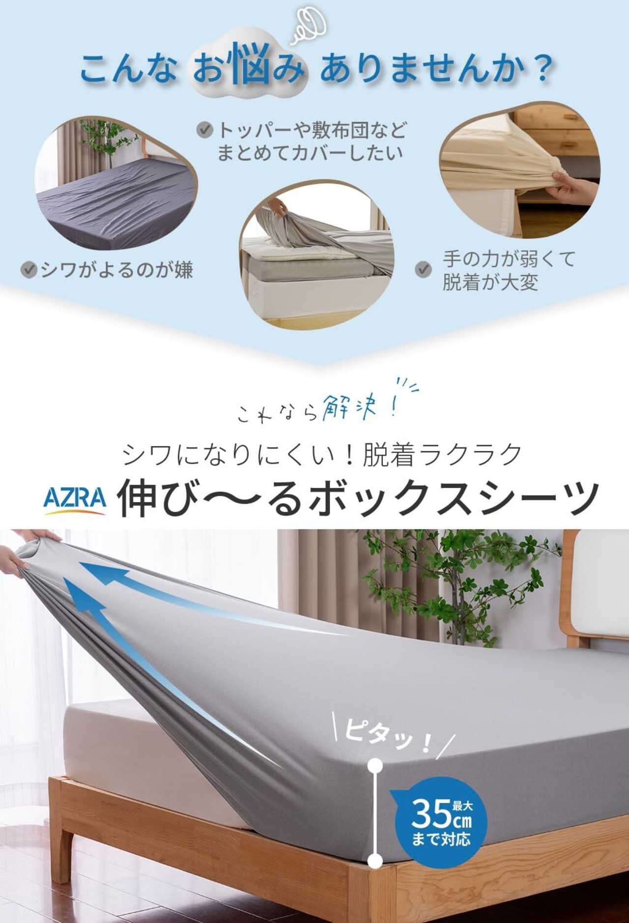 【お手入れ簡単・丸洗いOK】ご家庭の洗濯機で丸洗い可能。AZRAの伸びるボックスシーツは洗濯耐久性にも優れているので、いつでも清潔に保てます。洗い替え用に2枚以上のご購入がおすすめです。