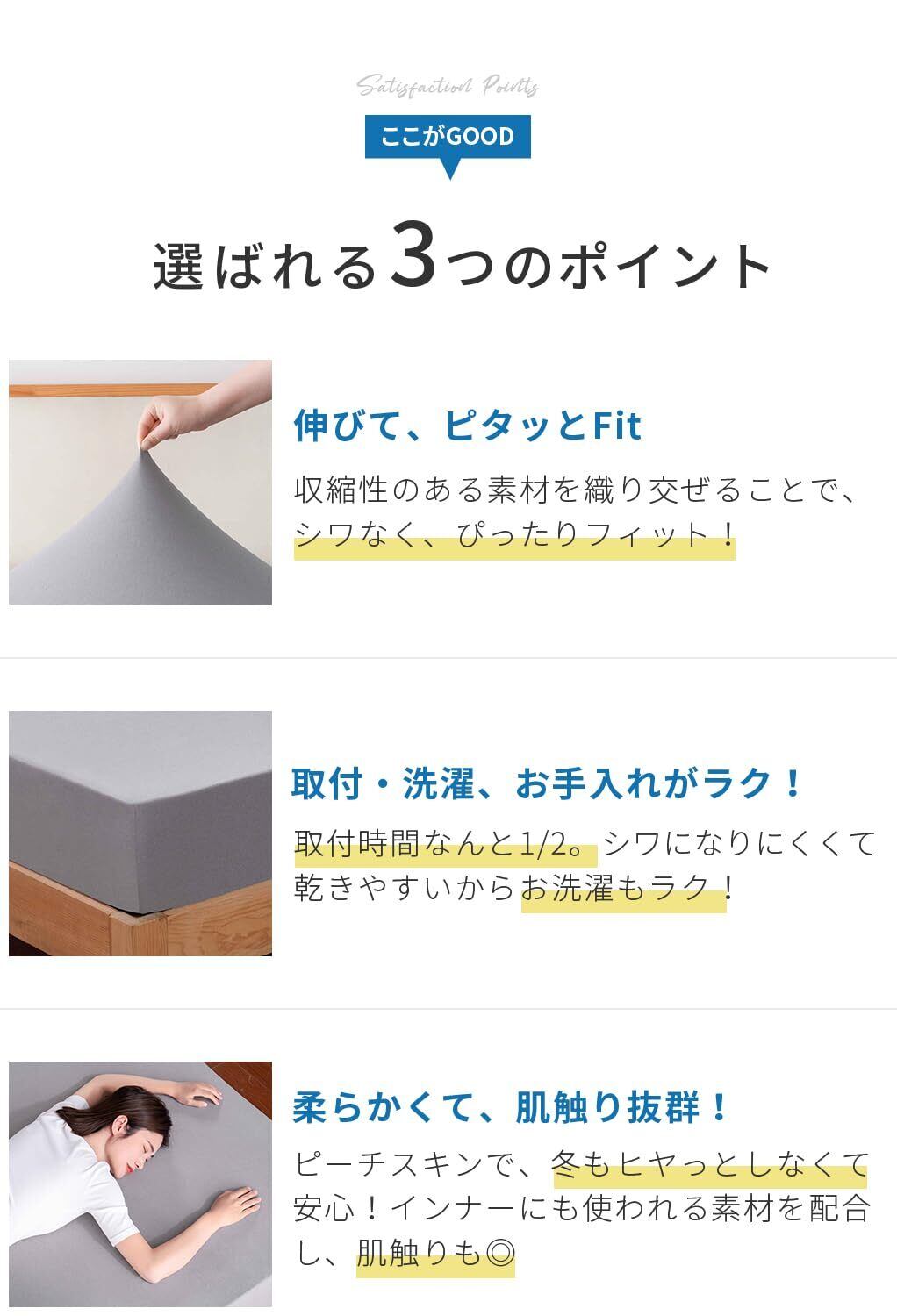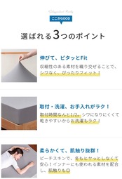 【3Dストレッチでぴったりフィット】ポリエステル93%+スパンデックス(ポリウレタン)7%の高弾力素材を使用するボックスシーツ。しっとりなめらかな手触りと高い伸縮性で、ベッドにぴったりフィットし、美しい仕上がりに。型崩れやシワにもなりにくく、使うたび心地よさを実感。