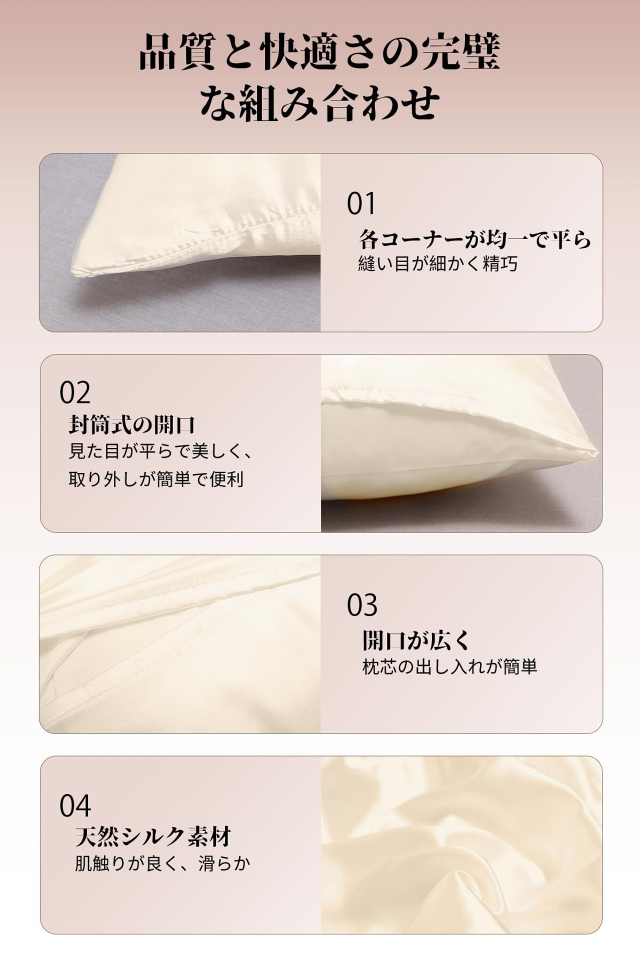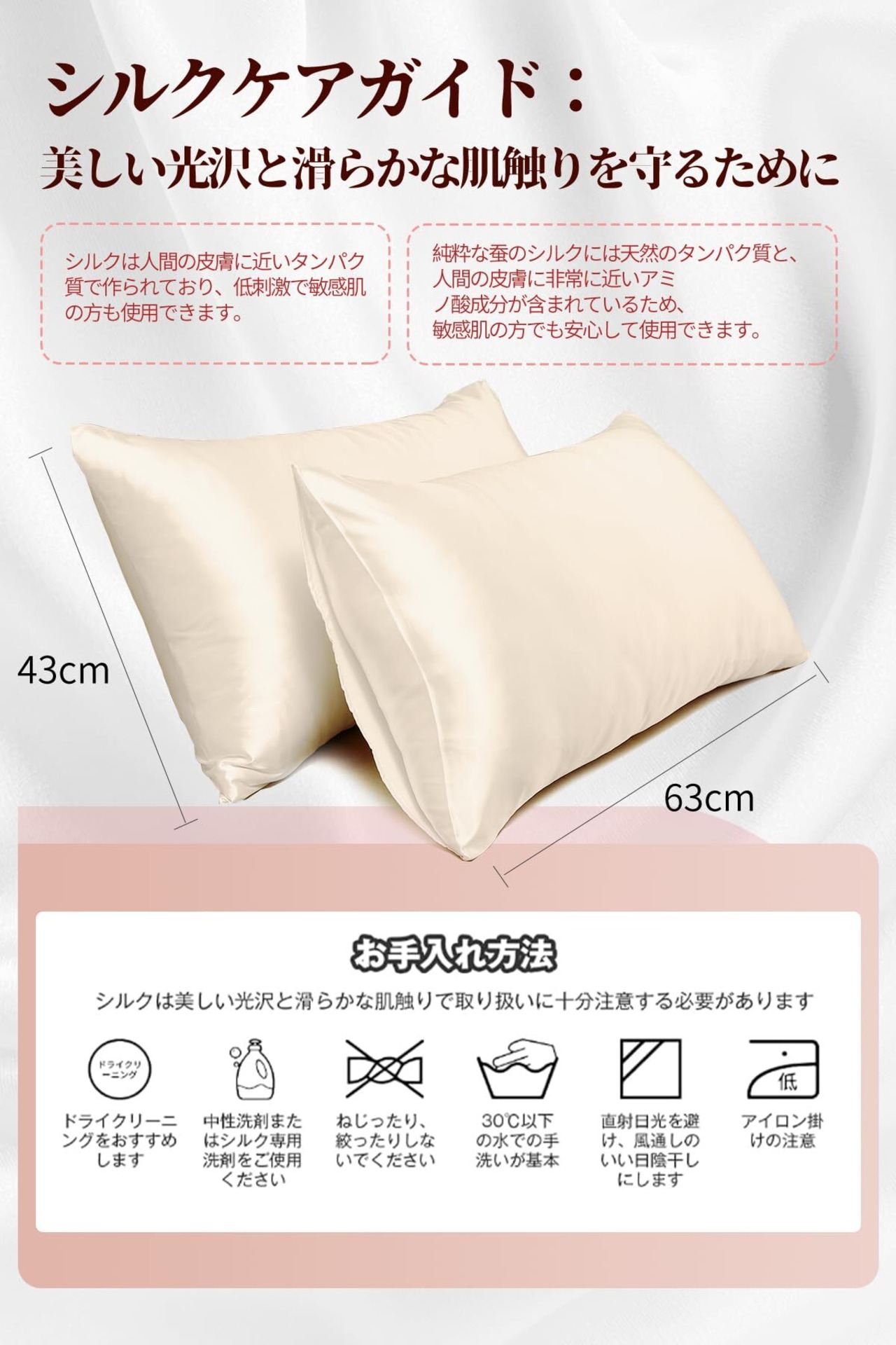 【洗濯後もシワになりにくく、耐久性がある】 シルク枕カバーは、滑らかなシルクの質感により摩擦によるダメージを大幅に減らすことができ、どんなに揉んだり洗ったりしてもシワになりにくいです。手洗いも可能で、手肌を傷めずに使用できます。また、シルク枕カバーは長期間使用しても損傷しにくく、耐久性に優れているため、家庭用の枕カバーとして最適です。