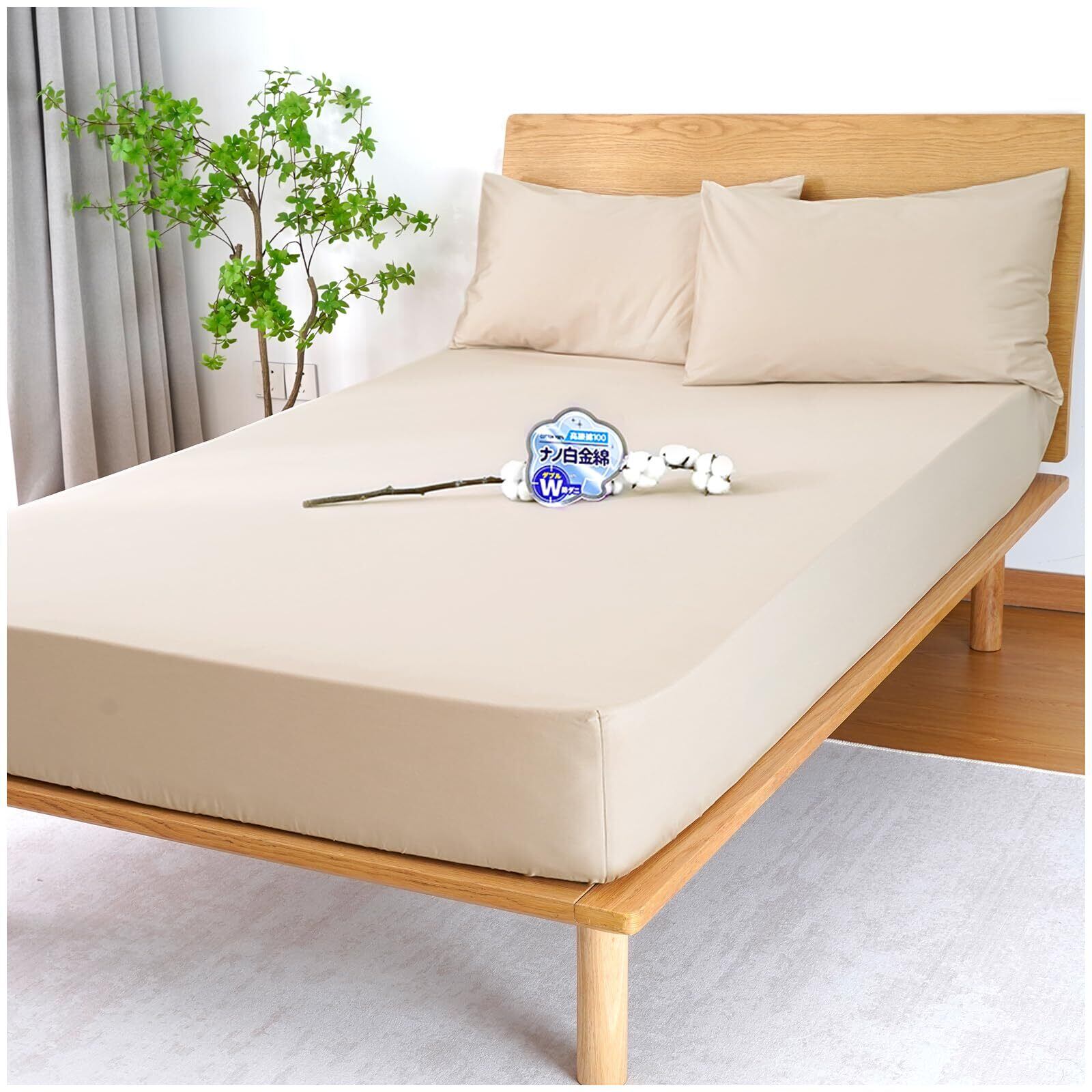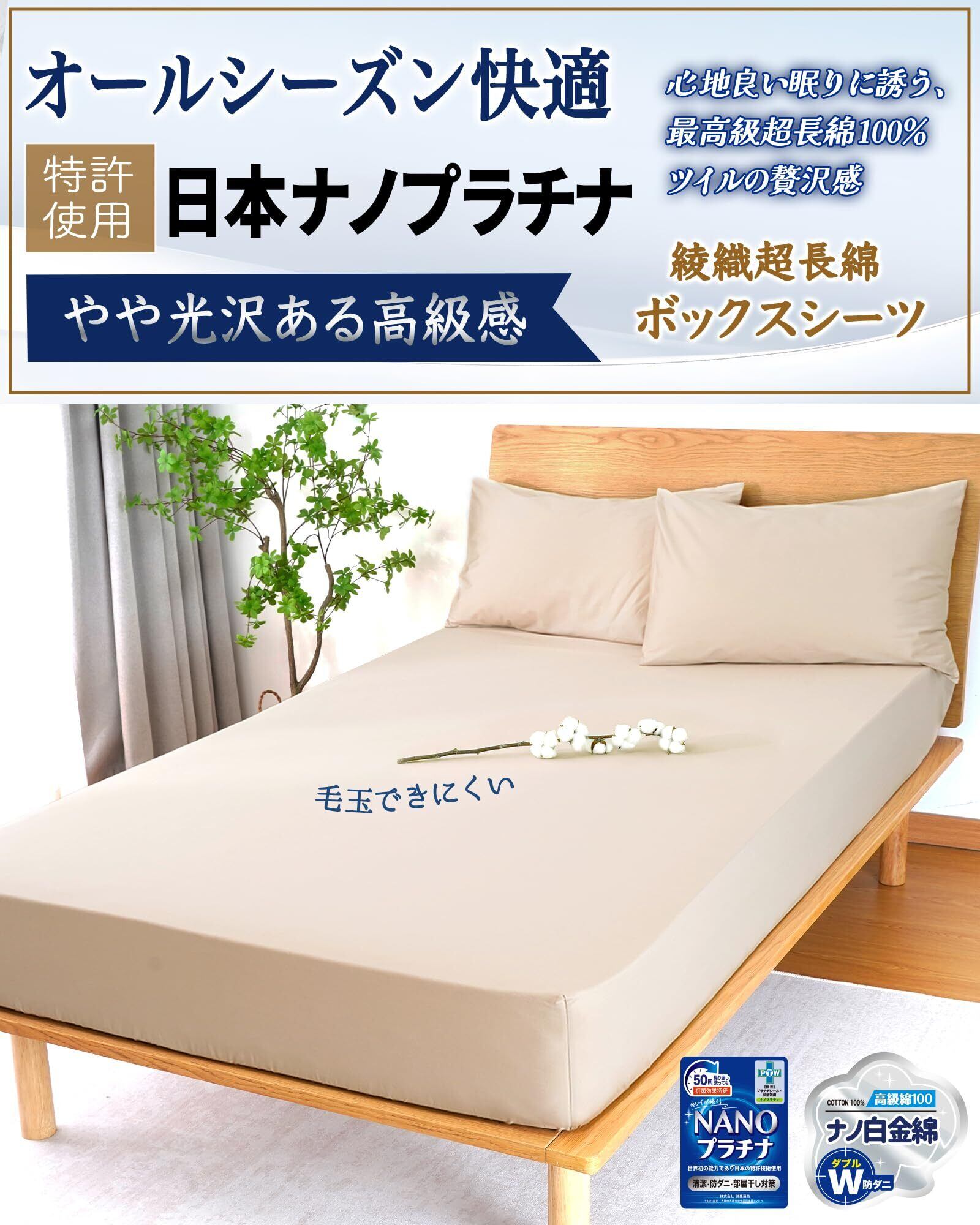 【特価セール】Maru Living【日本ナノ白金×高級綿100%】ボックスシーツ シングル 綿100 ベッドシーツ 綿 【高密度ツイル織り W抗菌防臭防ダニ】マットレスカバー ベッドカバー ホテル仕様 毛玉防止 光沢感 全周強化ゴム ベットカバー ベットシーツ コートン めん100 オールシーズン 洗える 通気性(シングル・ベージュ)