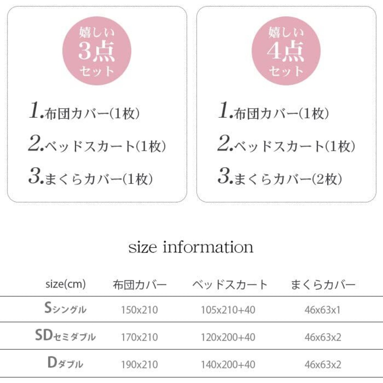 サイズ展開:3点セットシングルサイズ:布団カバー:150cm*210cm ボックスシーツ:105cm*(210+40マチ)cm まくらカバー:46cm*63cm*1点 /4点セットセミダブル:布団カバー:170cm*210cm ボックスシーツ:120cm*(200+40マチ)cm まくらカバー:46cm*63cm*2点/4点セットダブル:布団カバー:190cm*210cm ボックスシーツ:140cm*(200+40マチ)cm まくらカバー:46cm*63cm*2点