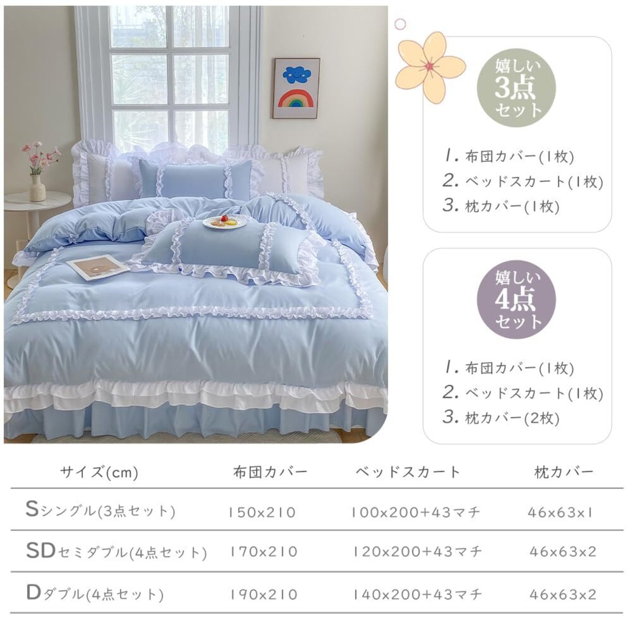 【特別価格】布団カバーセット 掛けふとんカバー 寝具カバー ふとんカバー シングル セミダブル 敷布団カバー 掛け布団カバー ベッドスカート 可愛い フリル付き 肌に優しい おしゃれ 姫風 可愛い 北欧 新生活 引っ越し 清潔 丸洗いOK (ブルー, シングル-3点セット)