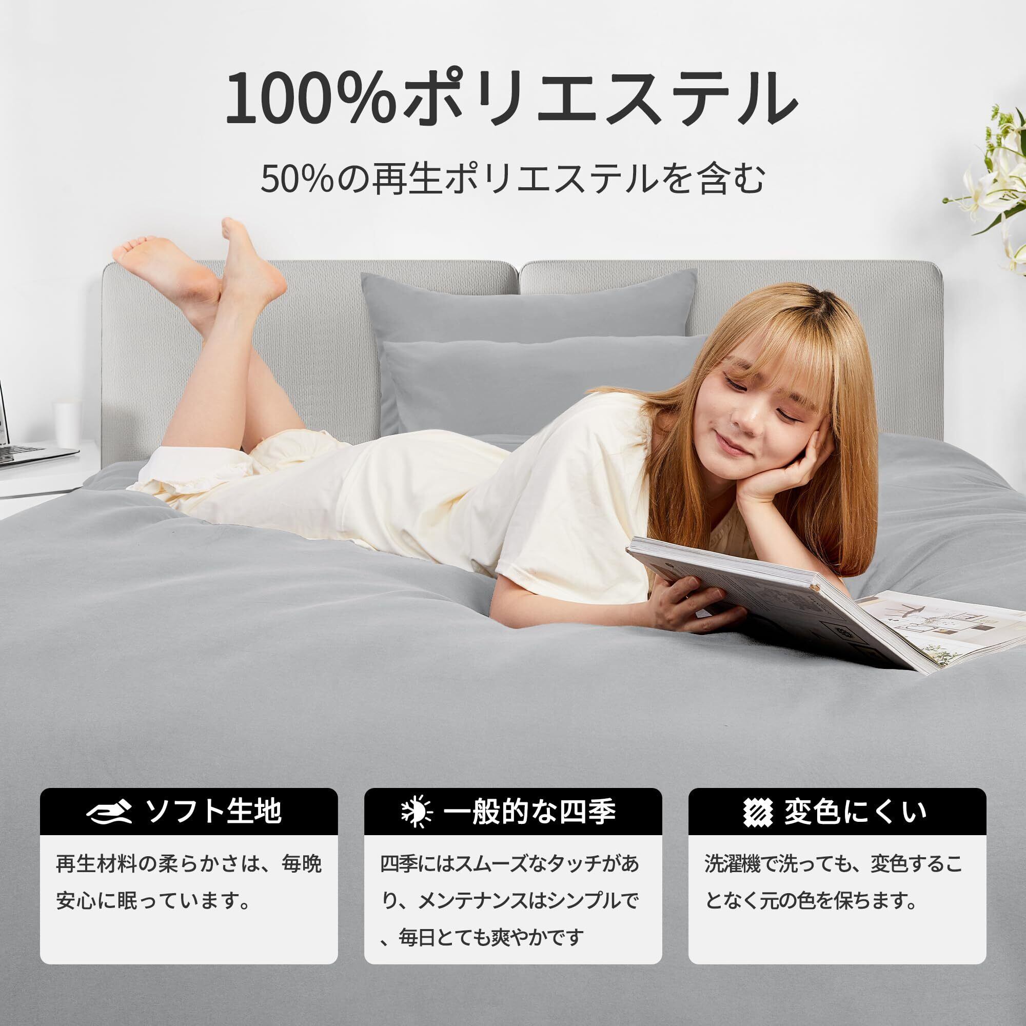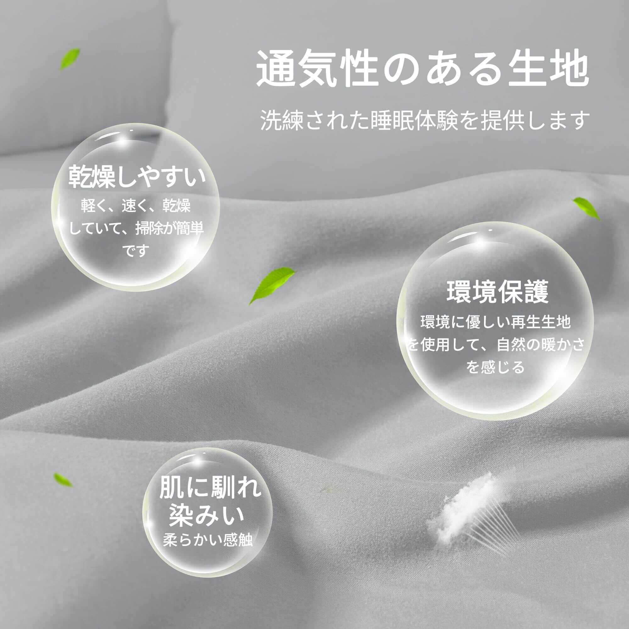 【GRS及びエコテックスの認証を取得する】持続可能な認証:GRS及びエコテックスの認証を取得した製品は、お客様と環境に安全な環境に優しい素材を使用しています。持続可能なライフスタイルに貢献するだけでなく、あなたとあなたの家族の健康のために安全であるだけでなく、環境に優しい製品を選択します。布団カバーと枕カバー、シーツの色柄に統一感を持たせると、よりまとまりのある寝室空間を演出できます。ホワイト、ダークグレー、ライトグレーなど豊富なカラーバリエ-ションにより、季節ごとに組み合わせを変えることでオールシーズンお部屋を鮮やかに彩ってくれます。家庭での丸洗いでも手洗いでも洗濯可能で、いつでも清潔感を保ています。素材によって、洗濯のしかたやお手入れの方法も異なります。ポリエステル素材は洗濯しても乾きやすいため、雨が続く季節に重宝するです。洗濯時に若干色落ち、色移りする場合がございますのでご注意ください。