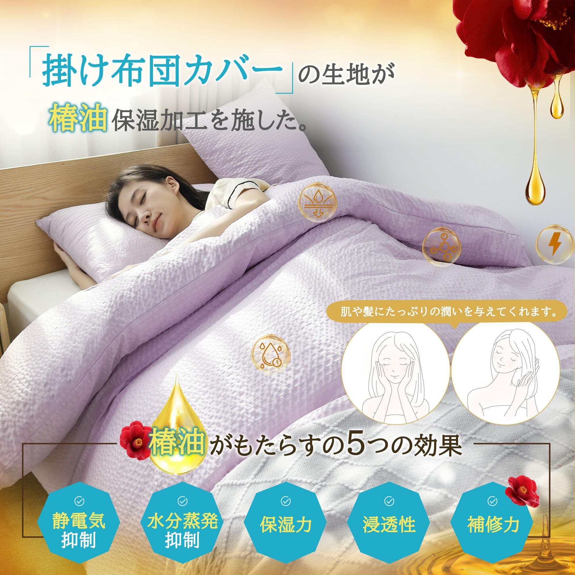 【椿油保湿・優しい肌触り】椿油は、非常に高い保湿力をもち、乾燥したお肌の角質層まで潤いを届け、つややかで弾力のある肌へ導きます。掛け布団カバーの生地が椿油保湿加工を施したため、優れた高保湿、防静電、皮膚再生保護の効果があります。やわらかな風合いとなめらかな肌ざわりが最高です!肌への刺激が少なく、肌が弱い人や子供にも使いやすい素材です。