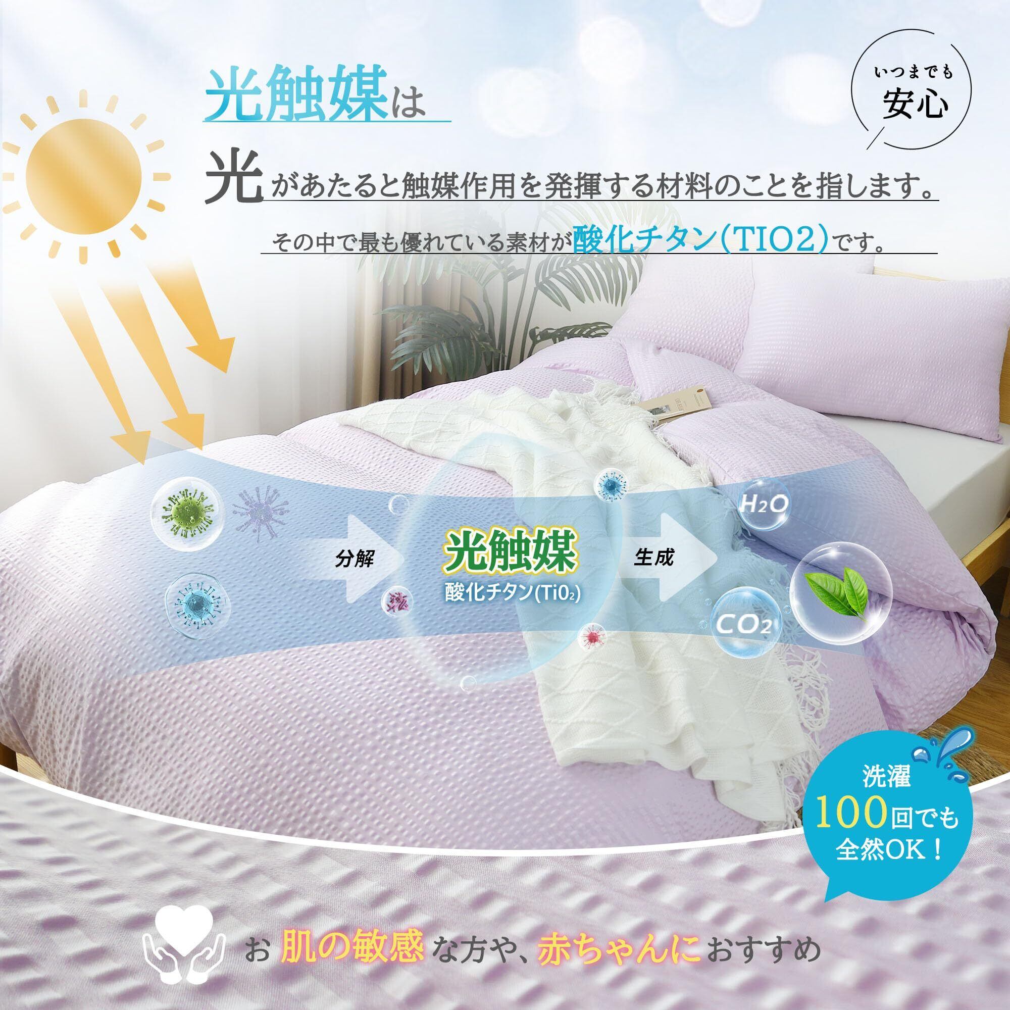 【光触媒加工・抗菌防臭・速乾】光触媒は光があたると触媒作用を発揮する材料のことです。いわゆる有機物を分解でき、汚れや臭いの除去や抗菌作用が得られます。さらに親水性であり,水分が汚れの下に入り込むことによって、汚れが浮き上がり、防汚効果を発揮します。また、生地自体が速乾性に優れているため、梅雨の季節など、洗濯物の乾きにくい時期にも便利です。お肌の敏感な方や、赤ちゃんにもおすすめできます。