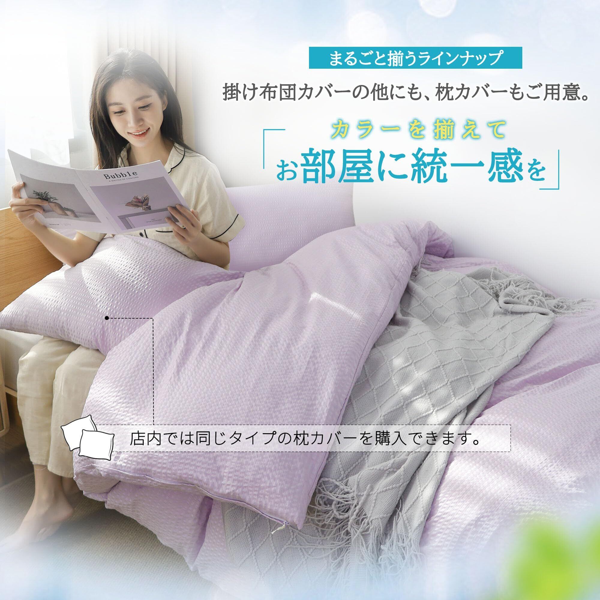 【シアサッカー風生地】掛け布団カバーはサラッとドライタッチな表面がポコポコとしたシアサッカー風の素材を使用。シアサッカーとはさらりとした感触で肌ざわりもよく、涼しくて快適な夏にオススメの素材です。くしゆくしゅしたシワ感が特徴的な凹凸感のある生地です。四季を通じて利用できます。