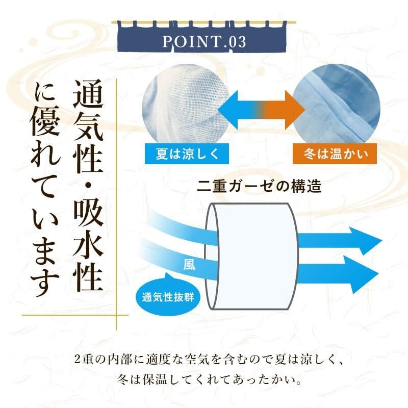 【オールシーズン】通気性・吸水性に優れています。2重の内部に適度な空気を含むので、夏は涼しく冬は暖かく過ごして頂けます。