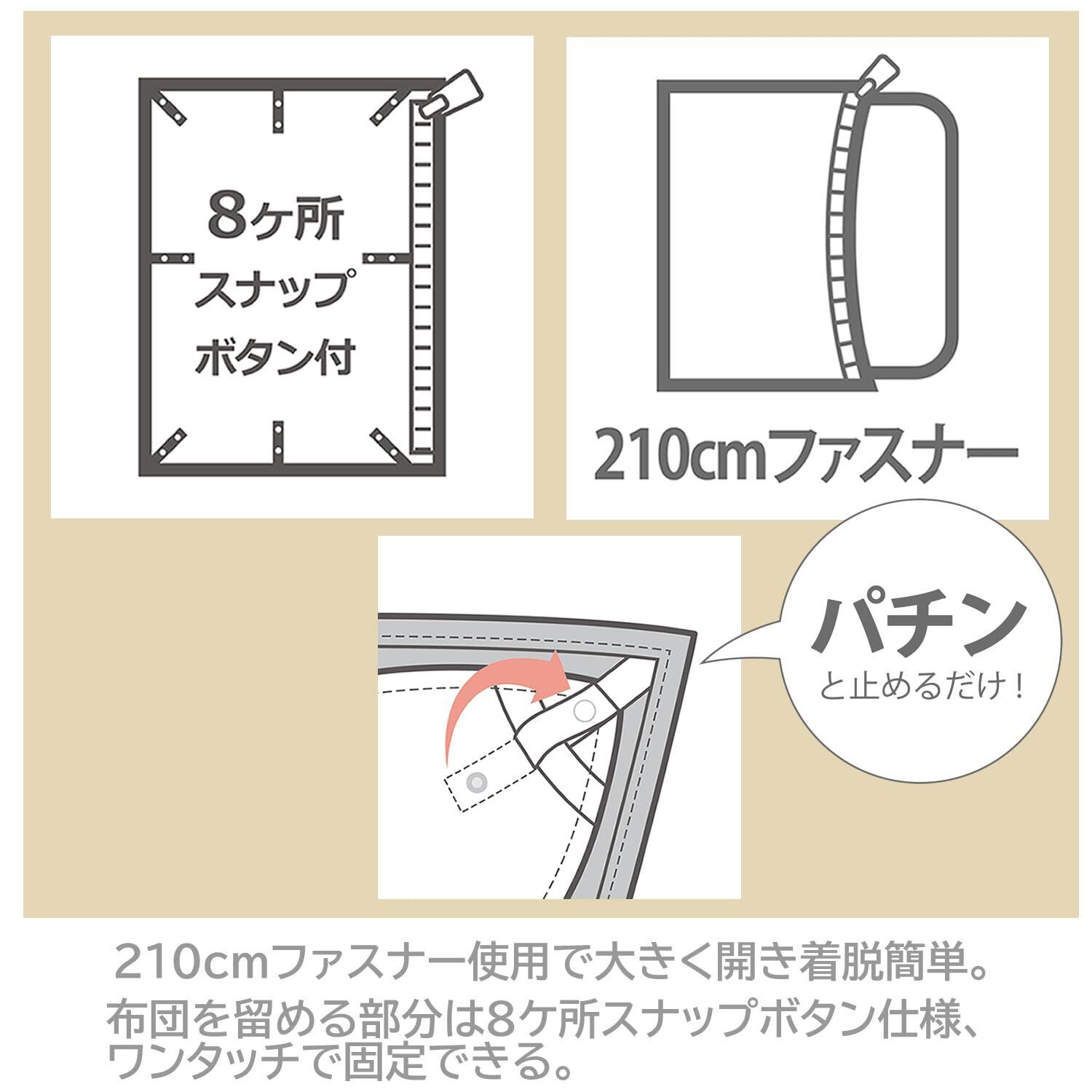 布団を留める部分は8ケ所スナップボタン仕様、ワンタッチで固定できる。210cmファスナー使用で大きく開き着脱簡単。