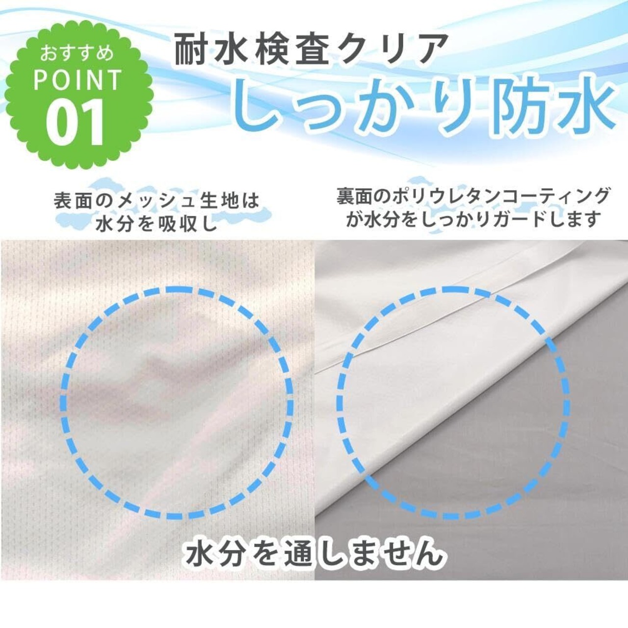 【防水と速乾の両立】お客様のご要望にお応えし、当店の防水シリーズから掛け布団カバーが登場しました!防水シーツは特性上洗濯機で脱水ができないため、乾かすのに時間がかかっていました。そこで、防水面には表地にソフトメッシュ生地、裏地にポリウレタンコーティングを採用することで防水性と速乾性の両立を実現!防水シーツ特有の乾きにくさを解消しました。冬場でも問題なくお洗濯可能です。※表面(メッシュ生地側)を外側にして折りたたんでから洗濯ネットに入れ、単独でお洗濯ください。脱水後、シーツの中に水が溜まっている場合がございますので、取り出す際はバケツなどの容器を使用し、水が溢れないように取り出していただくことをおすすめします。