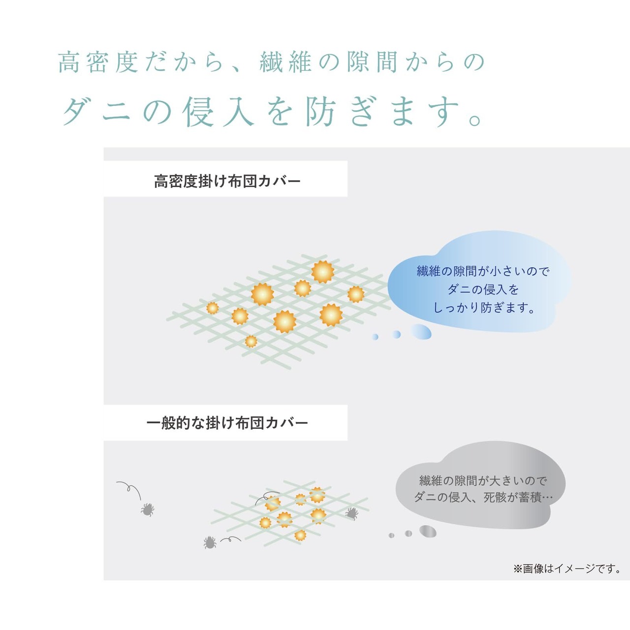 布団内部のダニやハウスダストの通過を防止するため高密度な生地でつくりあげた、肌触りの良い掛け布団カバーです。