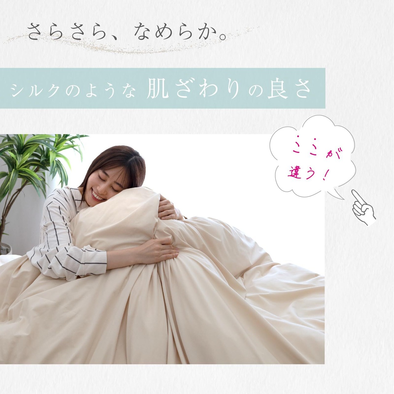 高密度カバーの「冷たくてツルツルした肌触り」を改善し、さらっとした優しい肌触りに仕上げています。