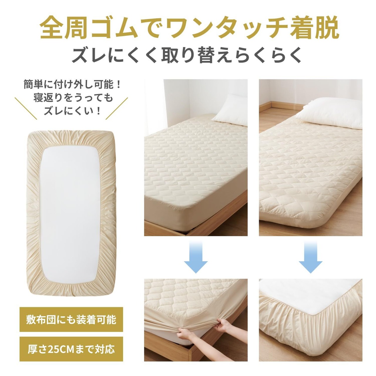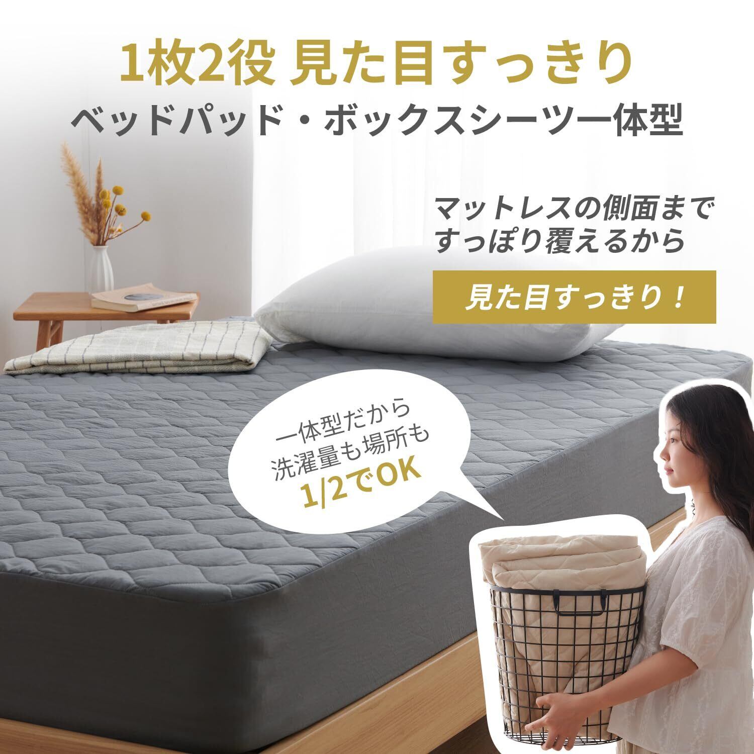 【簡単に整えられる一体型デザイン】ベッドパッドとボックスシーツが一体型になったデザインで、ベッドメイキングが驚くほど簡単!全周ゴム仕様で、寝返りをしてもズレにくく、常にきれいな状態を保ちます。これ一枚でシンプルに整えられるので、家事の時間を短縮し、快適さを持続できます。