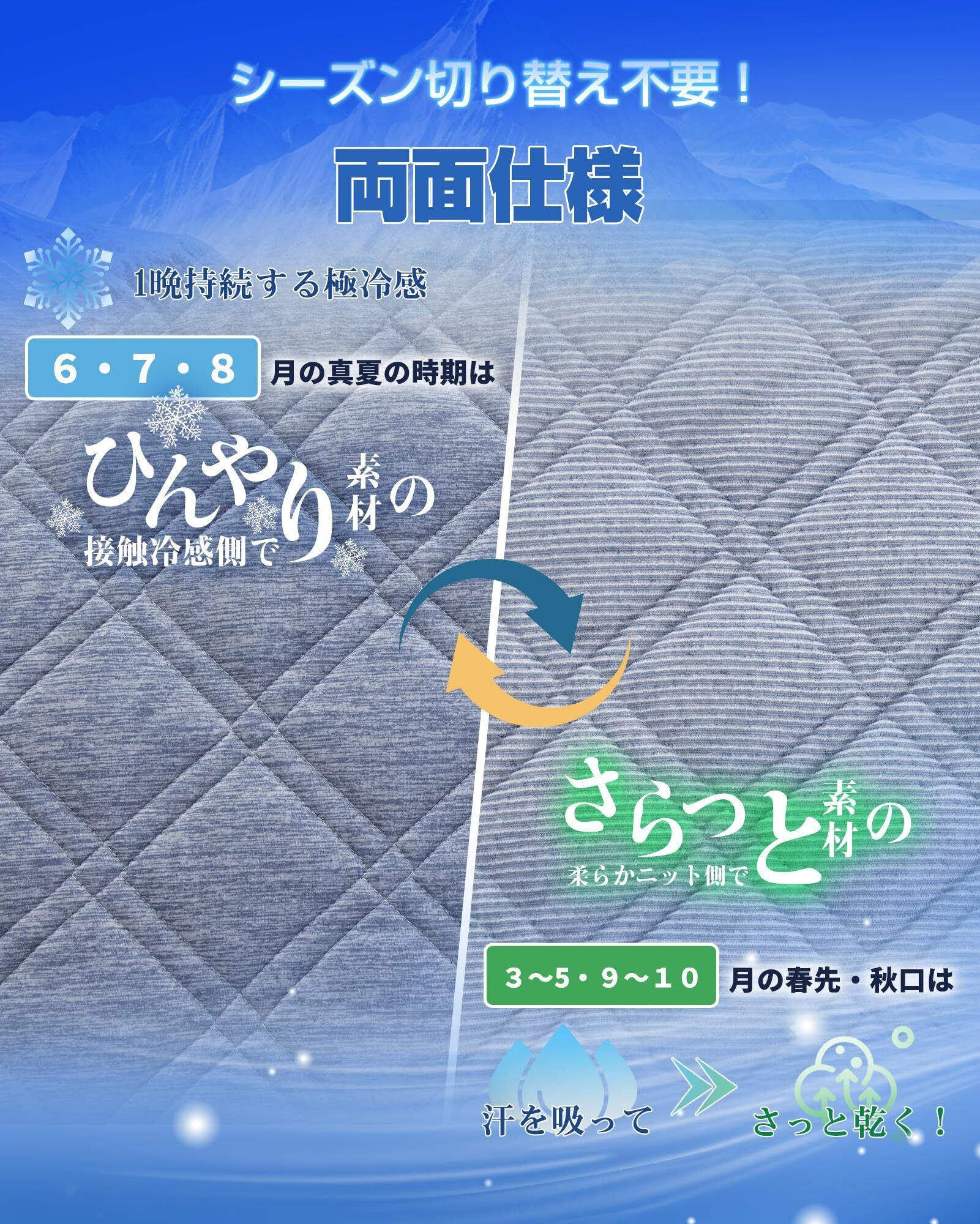 【完全リバーシブル・3シーズン対応スマート設計】 表面:Q-max0.516冷感面(夏推奨)→ 高温多湿環境下でも吸汗速乾 裏面:立体ニット面(春~秋)→ 肌なじみの柔らかさと通気性を両立 ※冬場は保温性のある別途寝具との重ね使いが可能