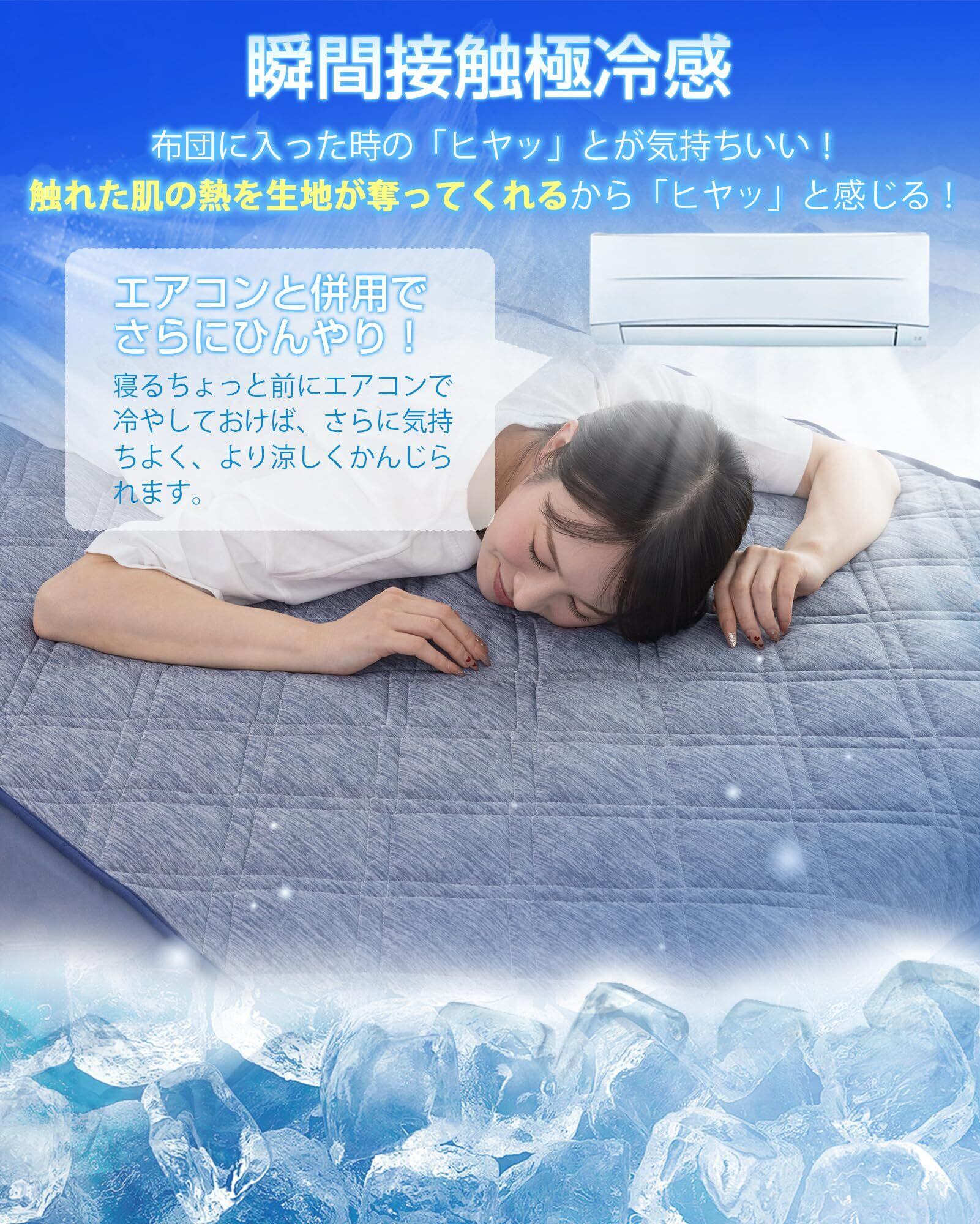 【業界トップクラス・瞬間冷却パワー】 ※冷感指標Q-max0.516(従来比+12%向上) 接触瞬間からひんやり感が持続する高密度ナイロン素材を採用。冷房や扇風機などを併用すると、さらにひんやりと気持ちよくお使いいただけます。