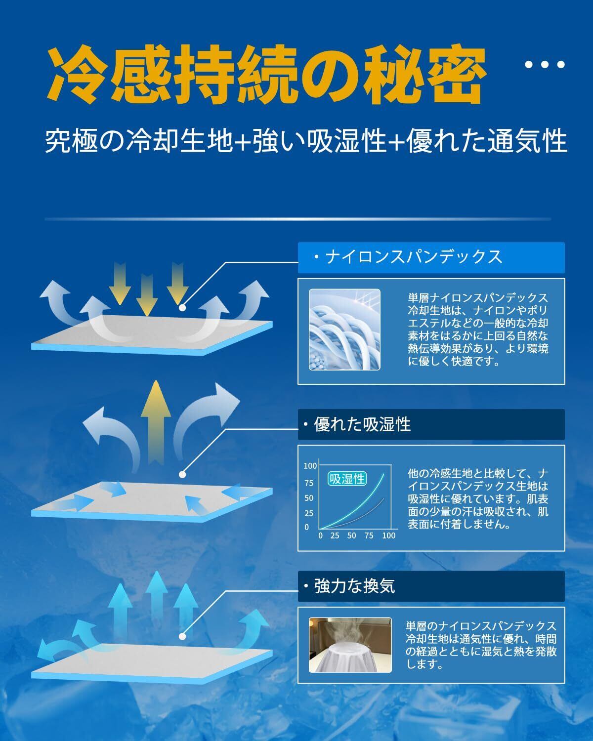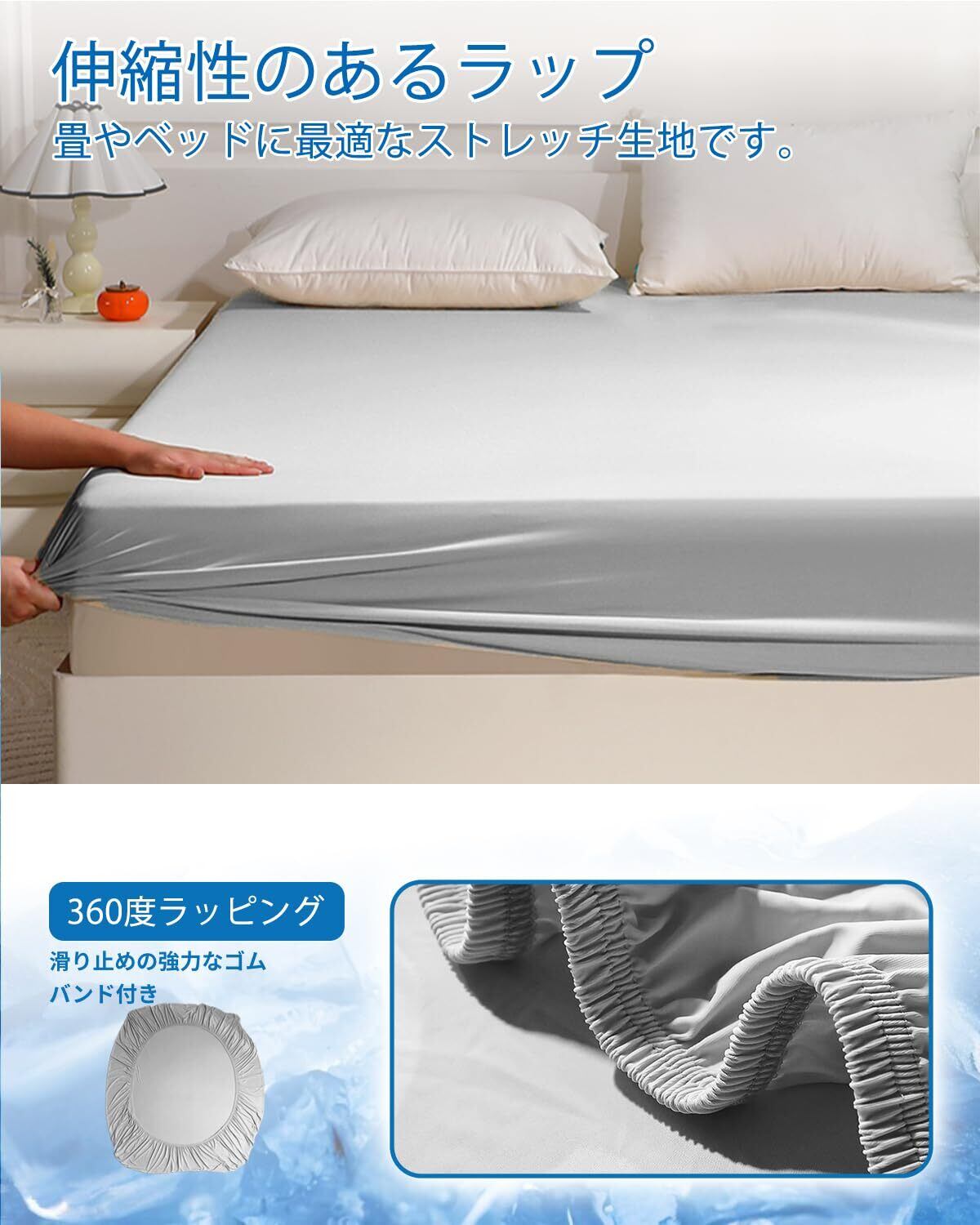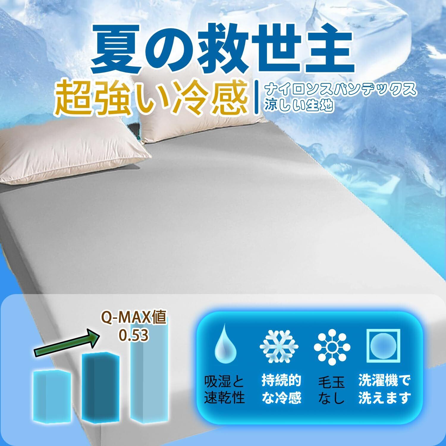 【接触冷感・Q-MAX0.53】本製品はナイロンとポリウレタンという2つの技術素材を採用し、優れた冷却効果を発揮します。Q-MAX値は0.53に達し、これは一般的な生地の3倍以上です。ひんやりとした接触冷感で、暑い夏でも快適な眠りをお届けします。従来の夏用フィットシーツとは異なり、本製品は耐久性に優れ、40回以上洗濯しても涼しさを保ち、夏を快適に過ごせます。