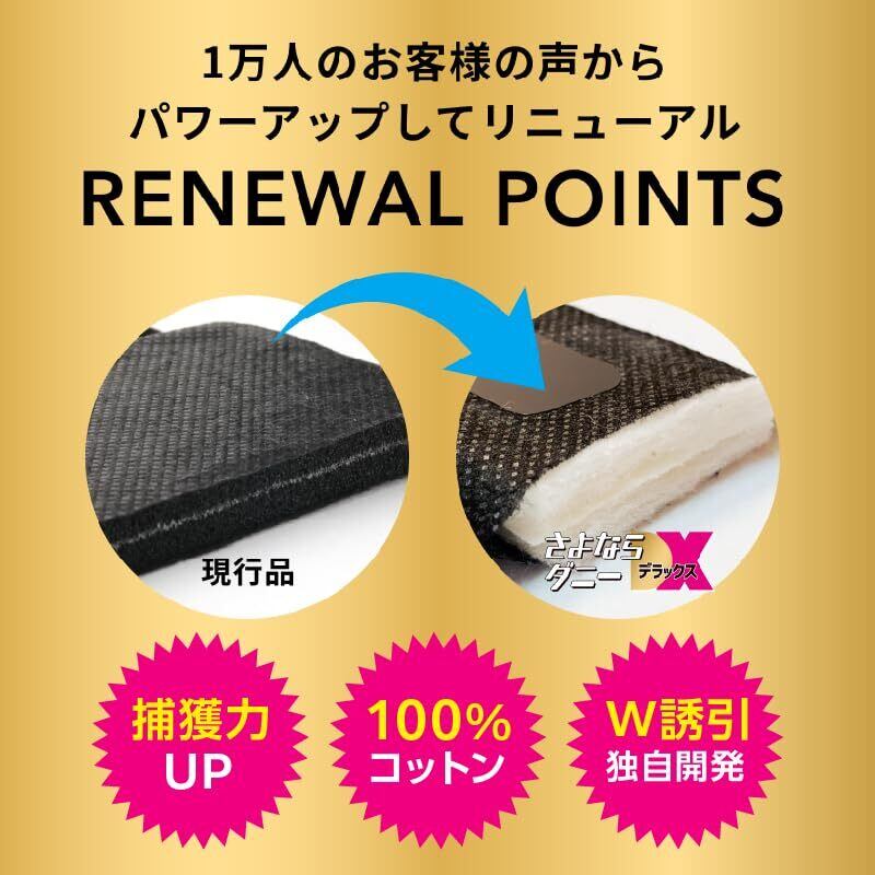 数多くのメディアでも取り上げられ、著名人もお薦めするサヨナラダニー。市場に数ある中でも実績と安心のダニ捕獲シート。ドラッグやホームセンターなどでの量販店でも一番人気のサヨナラダニー。量販店では安価バージョンですが、ついにWEB限定仕様のハイスペックバージョンとしてデラックスDXとなって登場。