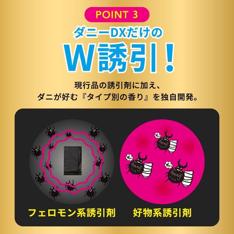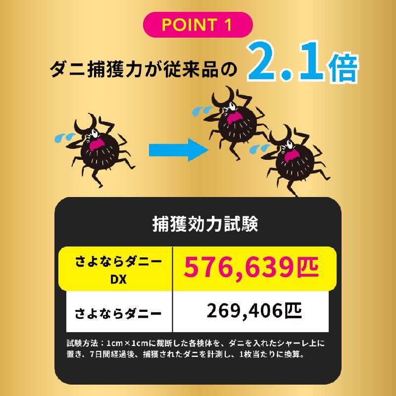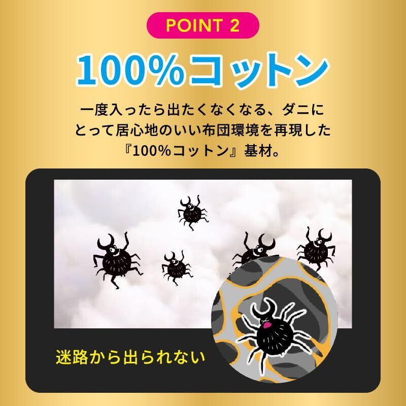 ●シリーズ最強の捕獲力。従来品の2.1倍。1枚で57万匹捕獲。(ラボデータ、メーカー調べ)●100%コットンはダニにとって居心地のいい環境を再現。一度入ったら出たくなくなる。●W誘引。従来品の誘引剤に加えダニが好む『タイプ別の香り』を独自開発。天然成分で殺虫成分ゼロ。安心素材でしっかり捕獲。