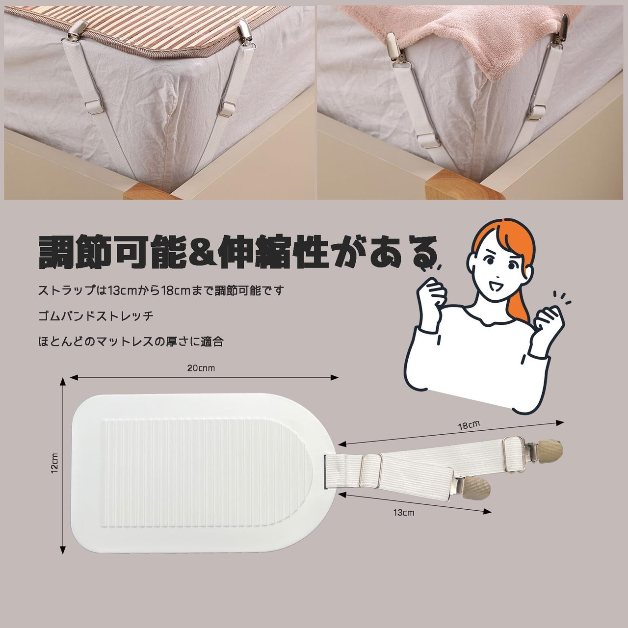 シーツクリップ, マットレス ズレ防止, 布団 、マットレス固定、毛布 クリップ シーツ固定具 バックル、 白、 4個入