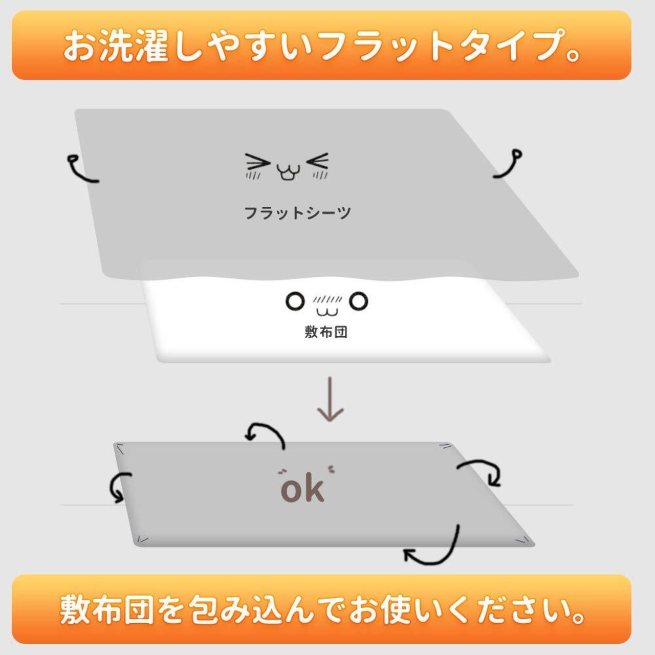 『仕様』お洗濯しやすいフラットタイプ。敷布団やマットレスを包み込んでお使い下さい。