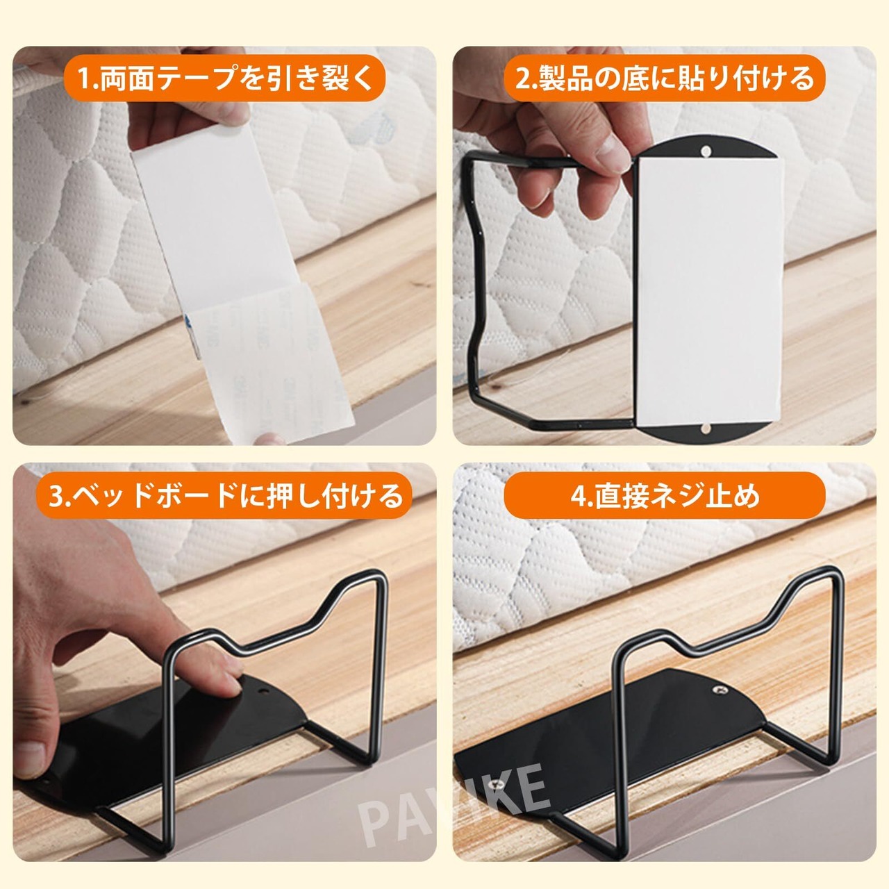 【取り付け簡単】マットレス固定バーの取り付けは非常に簡単です。 1.粘着力の強い両面テープで取り付ける方法と、2.ネジで取り付ける方法があります。 どちらの方法も素早く簡単に取り付けることができます。 取り付け方法は簡単で、誰でもすぐに取り付けられます。 短時間で安定した設置ができ、快適な座り心地をサポートします。