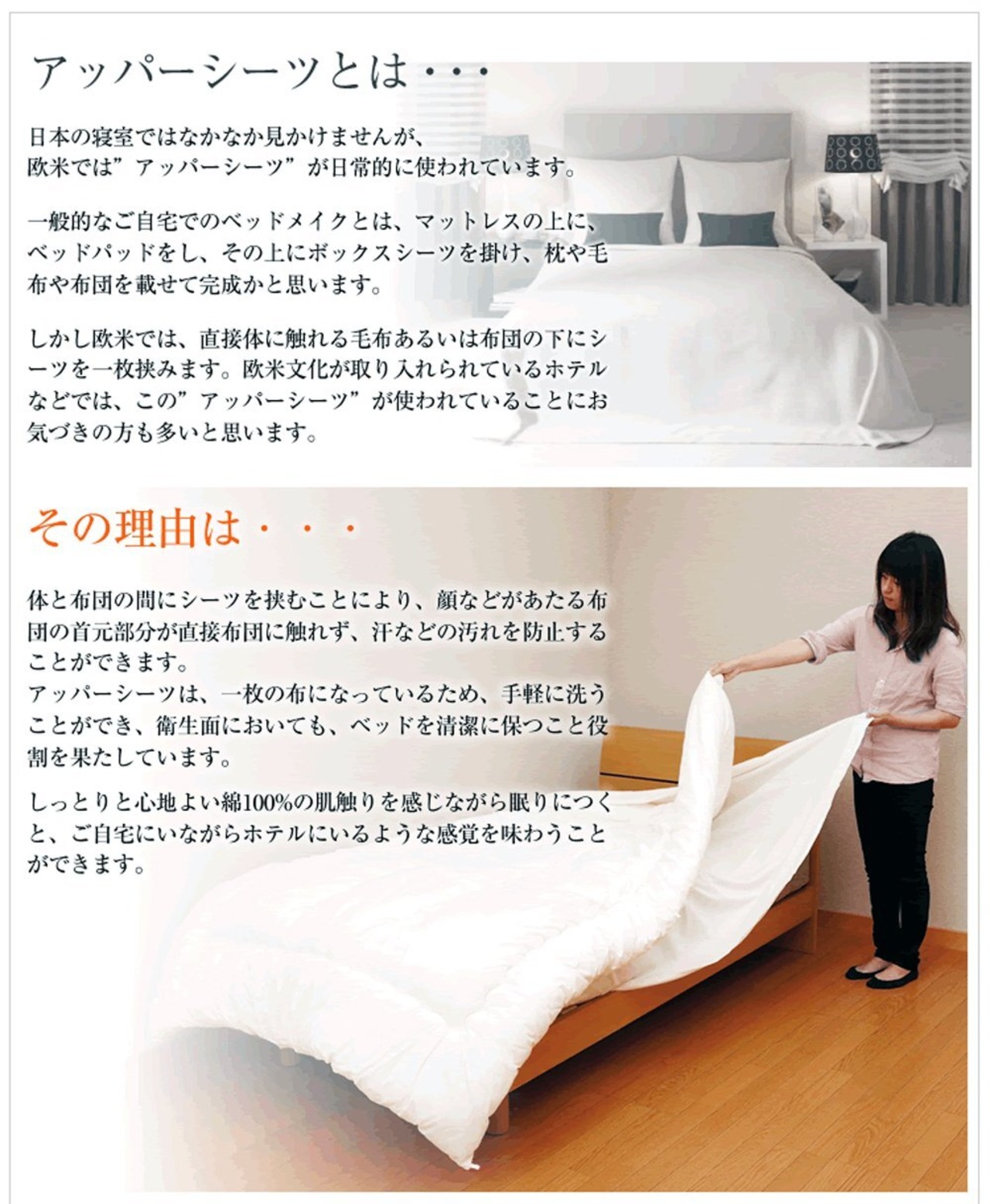 【フラットタイプ】1枚の布で、ベッドマットレス用にも敷き布団用にもなります。一枚ものの昔からあるシーツ。敷き布団などに敷き周囲を折り込んでいくタイプです。布団のサイズが特殊でもシーツより小さかったら対応できる。アッパーシーツは、(仰向けに寝られた場合、体の上に触れる部分です)羽毛ベッドカバーやお布団が直接体に触れて汚れるのを防ぎ、清潔に保ちます。