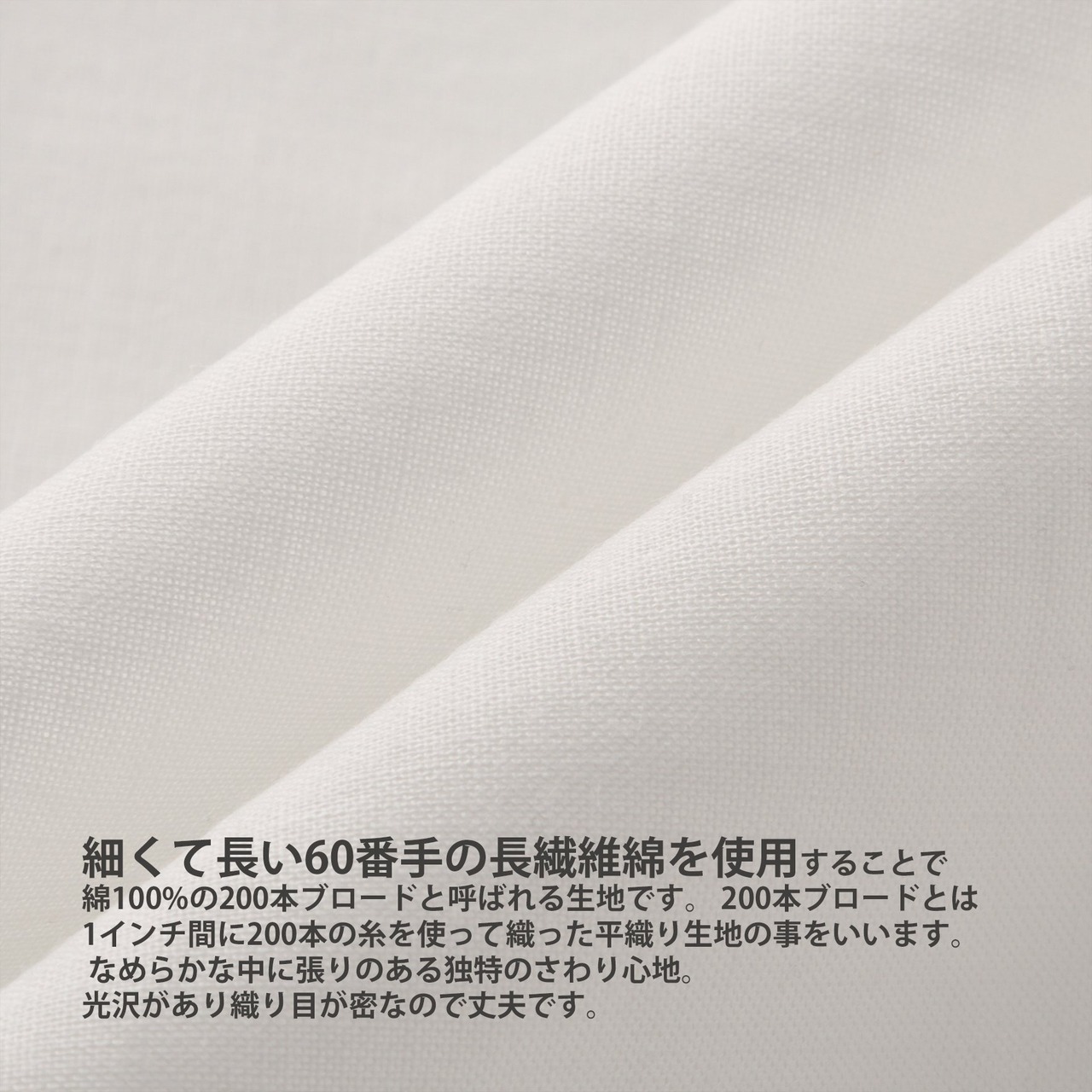 綿100%の200本ブロードと呼ばれる生地です。 200本ブロードとは、1インチ間に200本の糸を使って織った平織り生地の事をいいます。 なめらかな中に張りのある独特のさわり心地。 光沢があり織り目が密なので丈夫です。