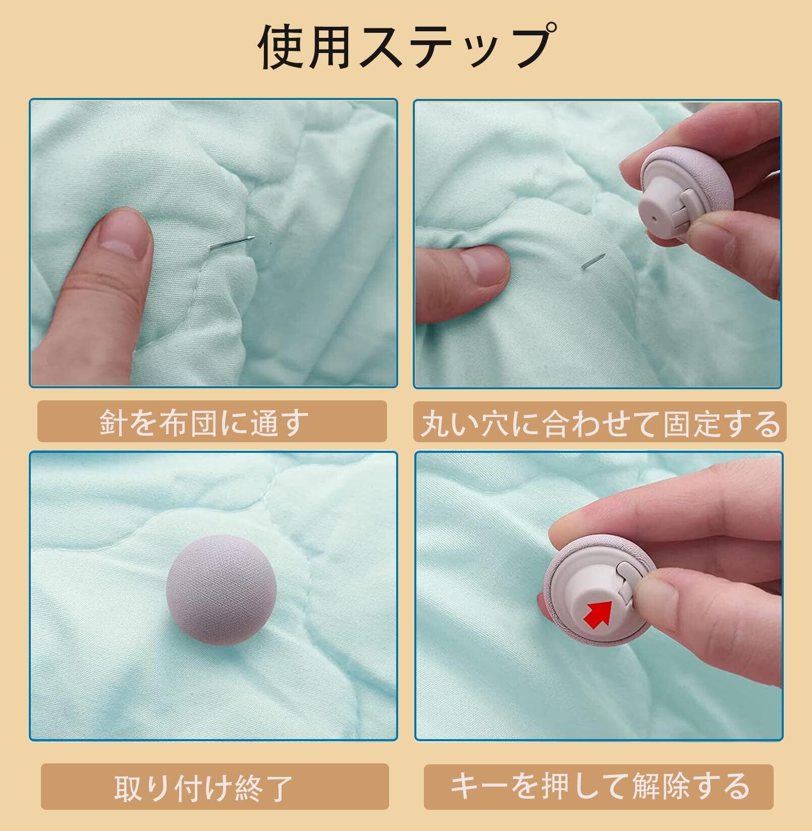 【使いやすい】ピンを布団に通し、ピンをマッシュルームボタンの丸穴に差し込むだけで固定できます。取り外したいときは、ボタンを直接押してロックを解除することができて便利です。(収納ボックス付き)