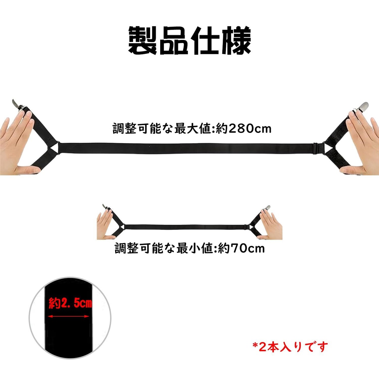 【セット内容とサイズパフォーマンス】1 セットに2 本入りのベッドシーツクリップをご提供!全長最大 280cm まで伸縮可能な弾性ベルトで、シングルからダブル、キングサイズベッドまで幅広く対応。スライド式調整機能で最短 70cm にも短縮できるため、ソファーカバーや敷パッドの固定にも使い分けられます。シーツのズレを防ぐための必須アイテムで、洗濯時は簡単に外せるのもポイント!