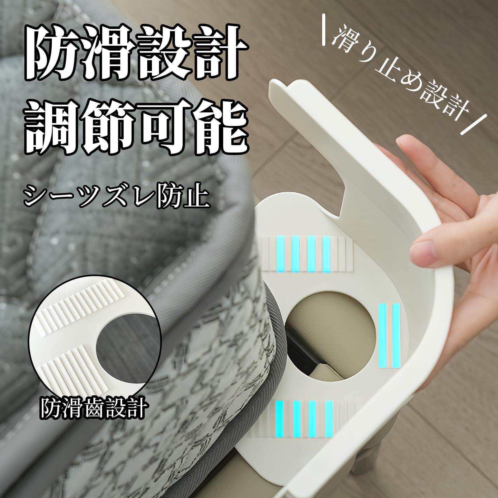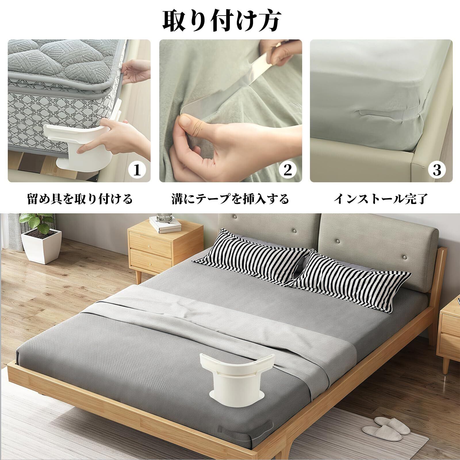 【取り付け簡単】マットを持ち上げてシーツ固定器を設置し、シーツを広げて白いセロテープでシーツを固定するだけです。1 ~ 2分でシーツ固定器の取り付けが完了します