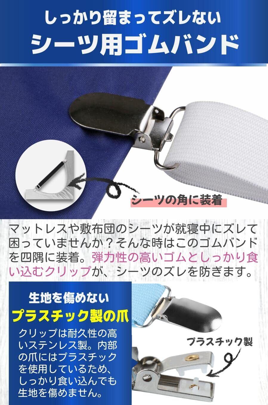 【シーツ用ゴムバンド】 マットレスや敷布団のシーツが就寝中にズレて困っていませんか?そんな時はこのゴムバンドを四隅に装着。弾力性の高いゴムとしっかり食い込むクリップが、シーツのズレを防ぎます。