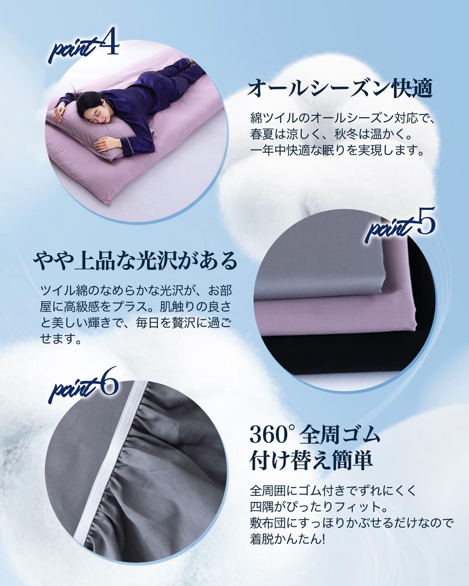 特徴 アレルギー保護, 抗菌防臭, 超長綿高級コーマ糸, 防ダニ性, 高密度ツイル織り
