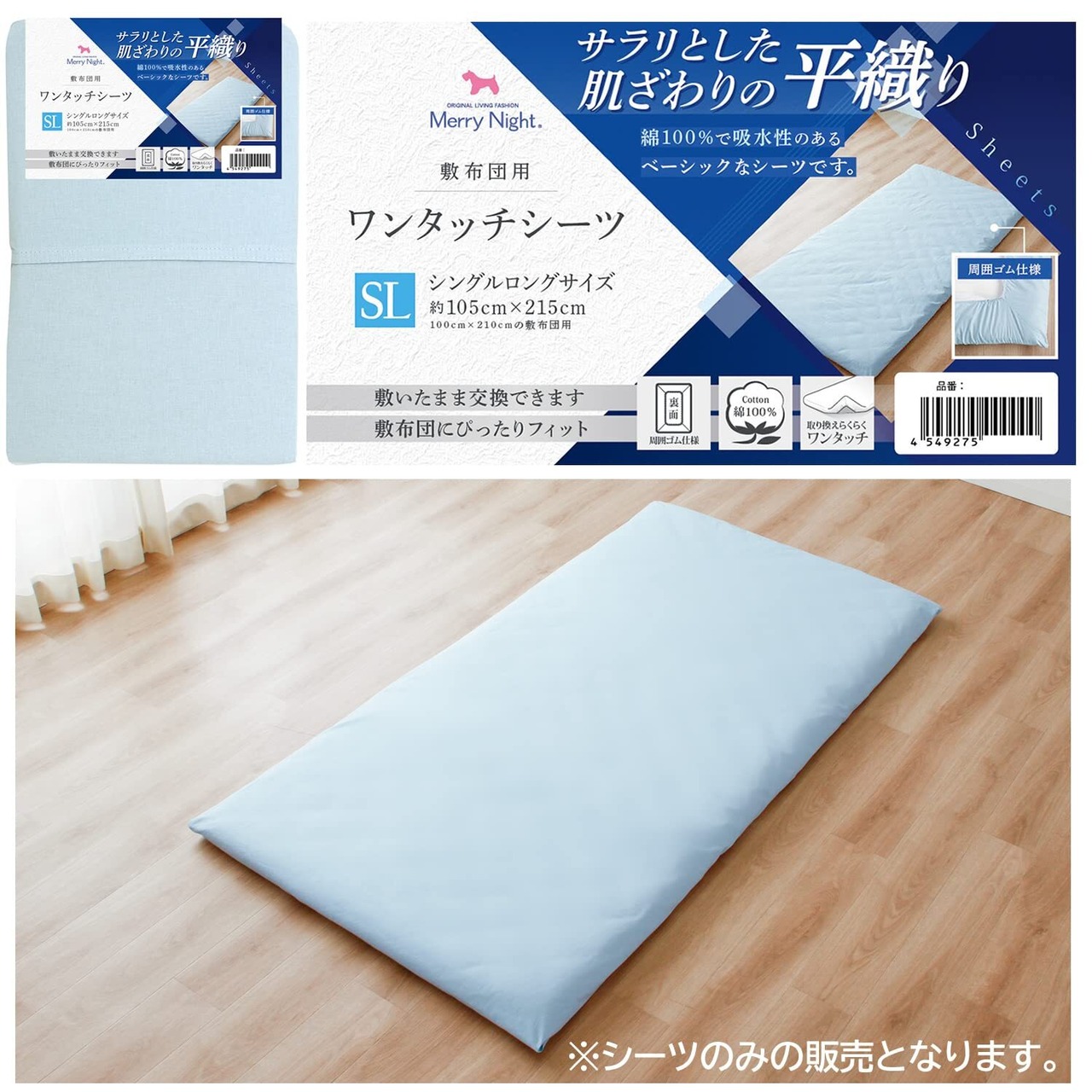 メリーナイト シーツ ワンタッチシーツ 平織生地 ブルー 敷布団用 シングルロング 約105×215cm 綿100% ベーシック生地 サラリとした肌ざわり オールシーズン 洗える 362001-76