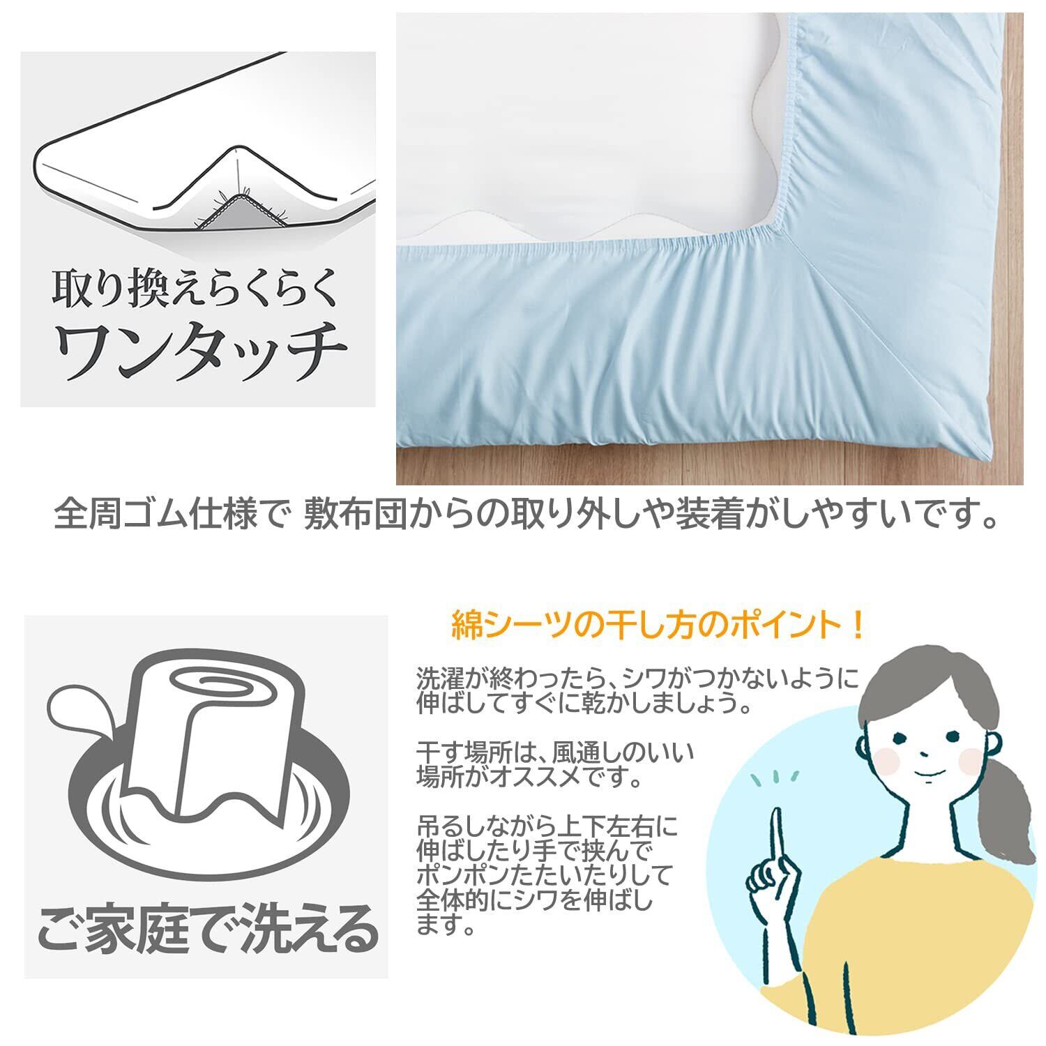 全周ゴム付きで敷布団からのシーツの交換が簡単です。シーツサイズは100×210㎝位までのシングルロングサイズの敷布団用。