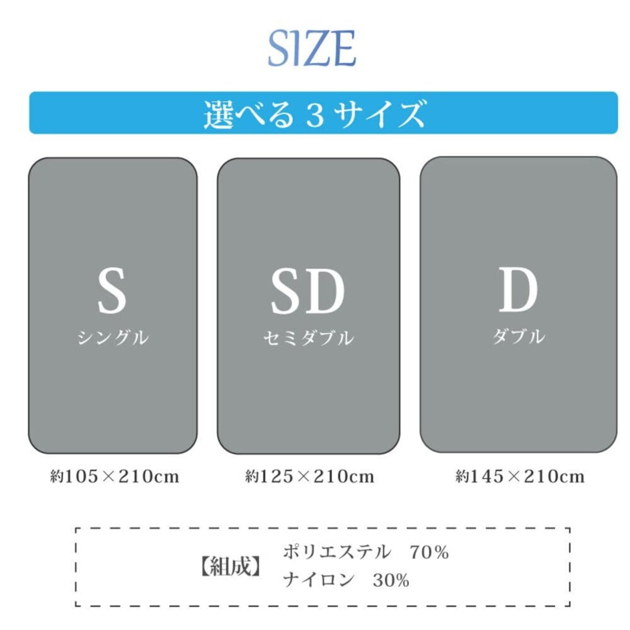 サイズ:(約) 105×210cm (シングルサイズ)、素材:ポリエステル 70%、ナイロン 30%