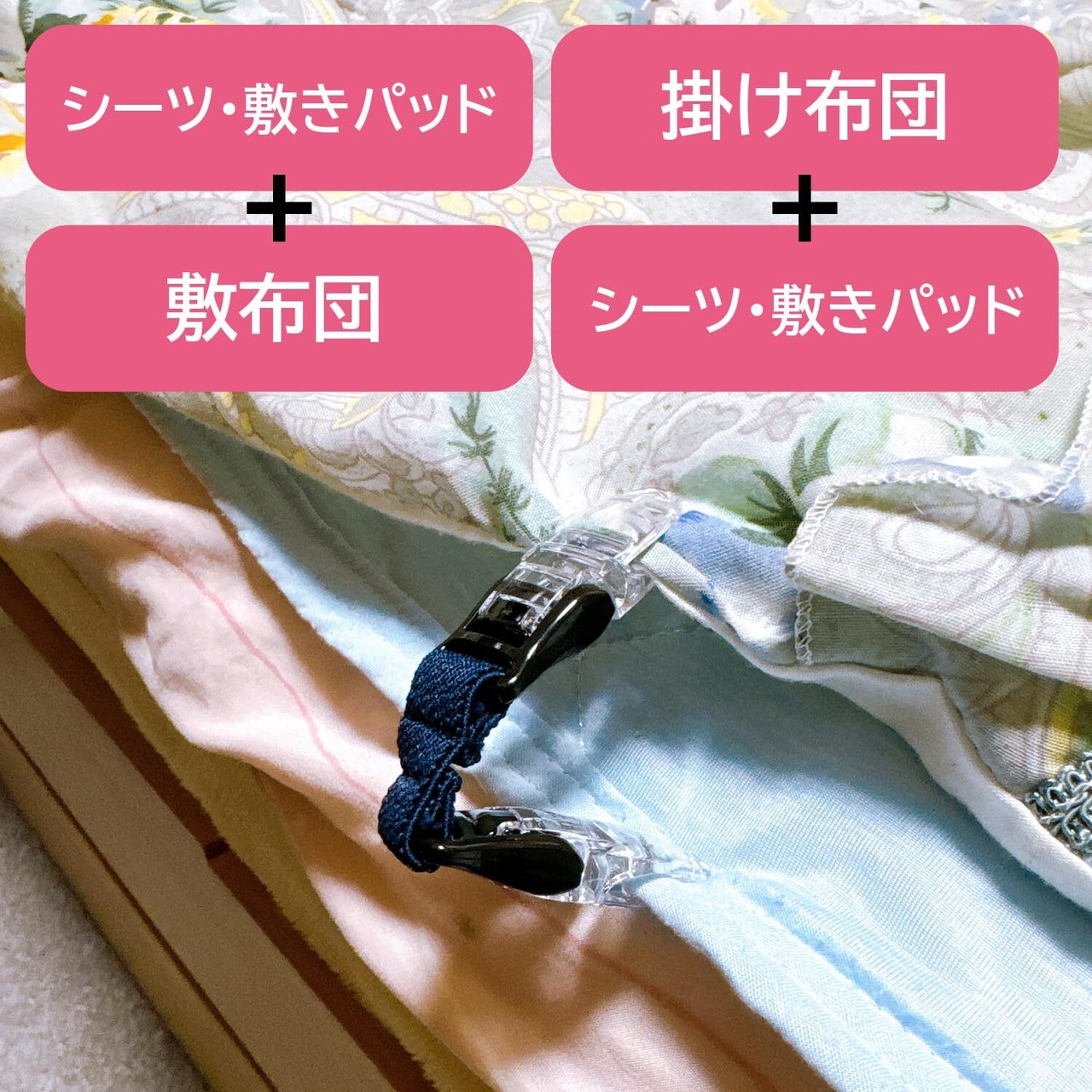 お布団やシーツをクリップではさんで留めるだけ!安全ピンなどを使わず、簡単、安全にお布団のずれ落ちを防ぐ、クリップ付きゴムバンドシリーズ「ズレないくん」です。敷布団のカバーと敷パッドやシーツ、敷パッドやシーツと掛け布団、などなど、クリップで固定してお使いください。