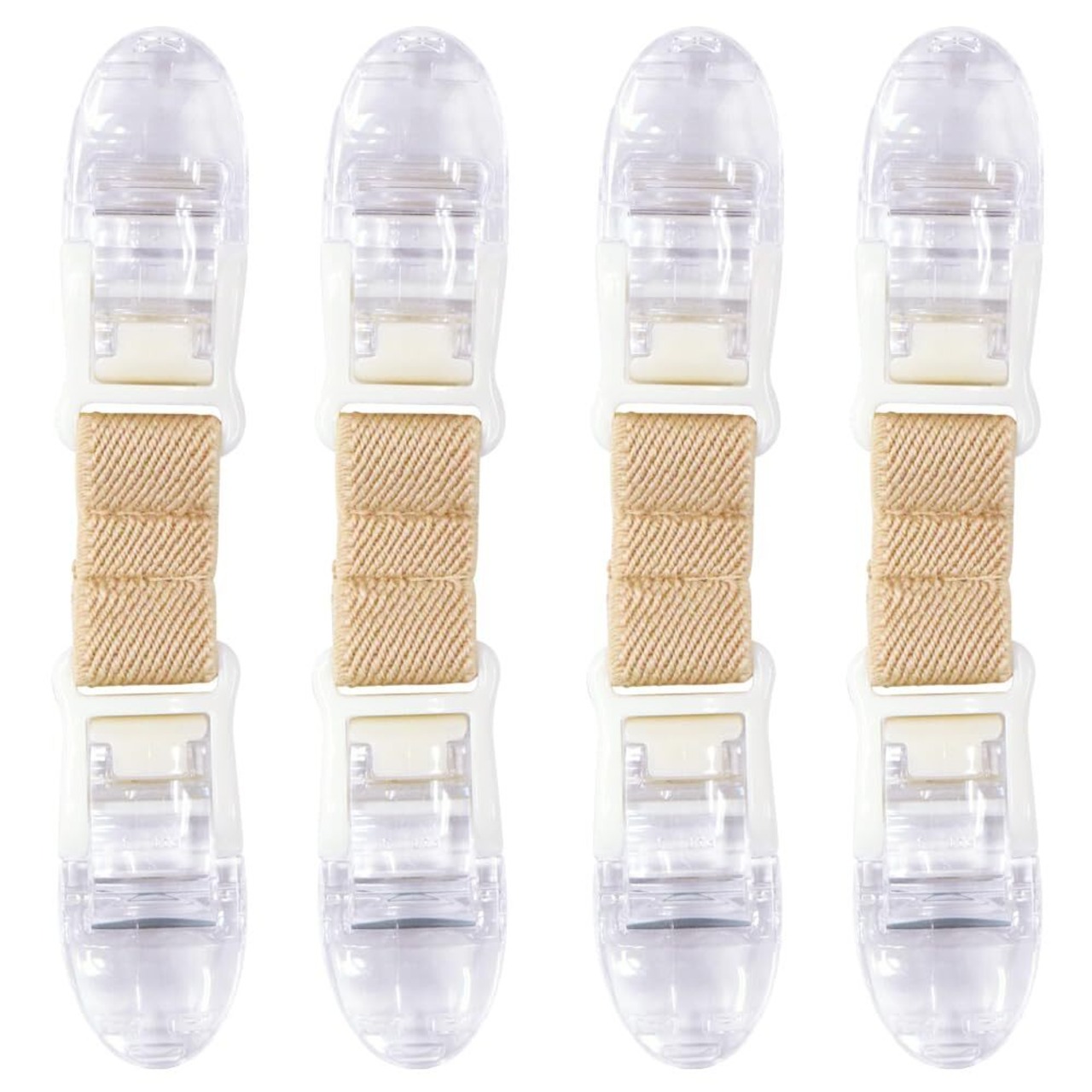 お布団やシーツをクリップではさんで留めるだけ!安全ピンなどを使わず、簡単、安全にお布団のずれ落ちを防ぐ、クリップ付きゴムバンドシリーズ「ズレないくん」です。敷布団のカバーと敷パッドやシーツ、敷パッドやシーツと掛け布団、などなど、クリップで固定してお使いください。市販の布団襟カバーを別途購入しなくても、自宅にあるバスタオルで代用できますので、簡単で経済的。掛けカバーの面倒なつけ外しや、洗濯の手間も省けます。寝苦しい夏はもちろん、汗をかきやすいお子様、介護、加齢臭などで頻繁に洗濯したい方にもお勧めです。クリップのレバー(色がついている部分)を上または下に倒して開閉するタイプです。お布団の襟カバー留めの他、タオルで枕カバーにも活躍します。※基本1ミリ程度のものをはさむことを前提としたクリップです。無理にはさむと破損の危険がありますので、薄手の生地をおすすめします。ゴム紐にはウレタンゴムを使用、アレルギーの方も安心のラテックスフリーです。※現在素材を天然ゴムからウレタンゴムに切り替えている最中です。入り数や色によっては素材が異なる場合がございます。ネイビーの4本セットは天然ゴムを使用しておりますのでご注意ください。※色:アイボリー ※全長11cm、ゴム巾1.5cm、クリップ最大長:約4.8cm/巾最大2cm・口あき最大12mm(内突起内10mm程度)。クリップの性質上、はさんだ布にあとがついたり、ひっかき傷ができる場合があります。繊細な布地への使用はおさけください。縫製、素材の都合上長さに個体差が生じます。汚れた場合は手洗いをして水けを切り、陰干しをしてください。洗濯機や乾燥機は故障の原因になりますのでご使用にならないでください。洗剤、漂白剤、ハンドクリーム、消毒用アルコール等の薬剤がクリップの劣化を早め、破損の原因になる場合がございますのでご注意ください。本品に使用しているクリップの海外製類似品、模倣品が出回っております。質感や品質に大きな違いがございます為、十分にご注意ください。