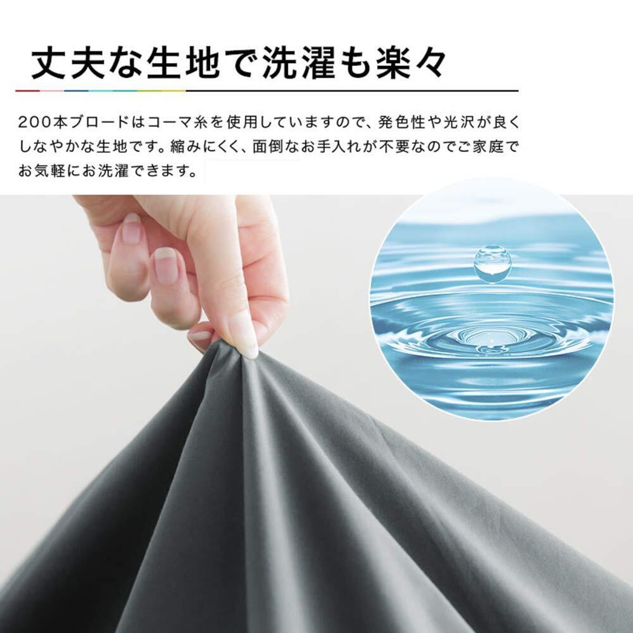 【素材】天然素材綿100%。良質で高価な40番手の超極細糸を使用し、打ち込み本数は200本です。良質な綿を丁寧に織り上げることにより、肌ざわりのやさしい生地に仕上がりました。目詰みも良く、耐久性にも優れたしっかりとした生地です。