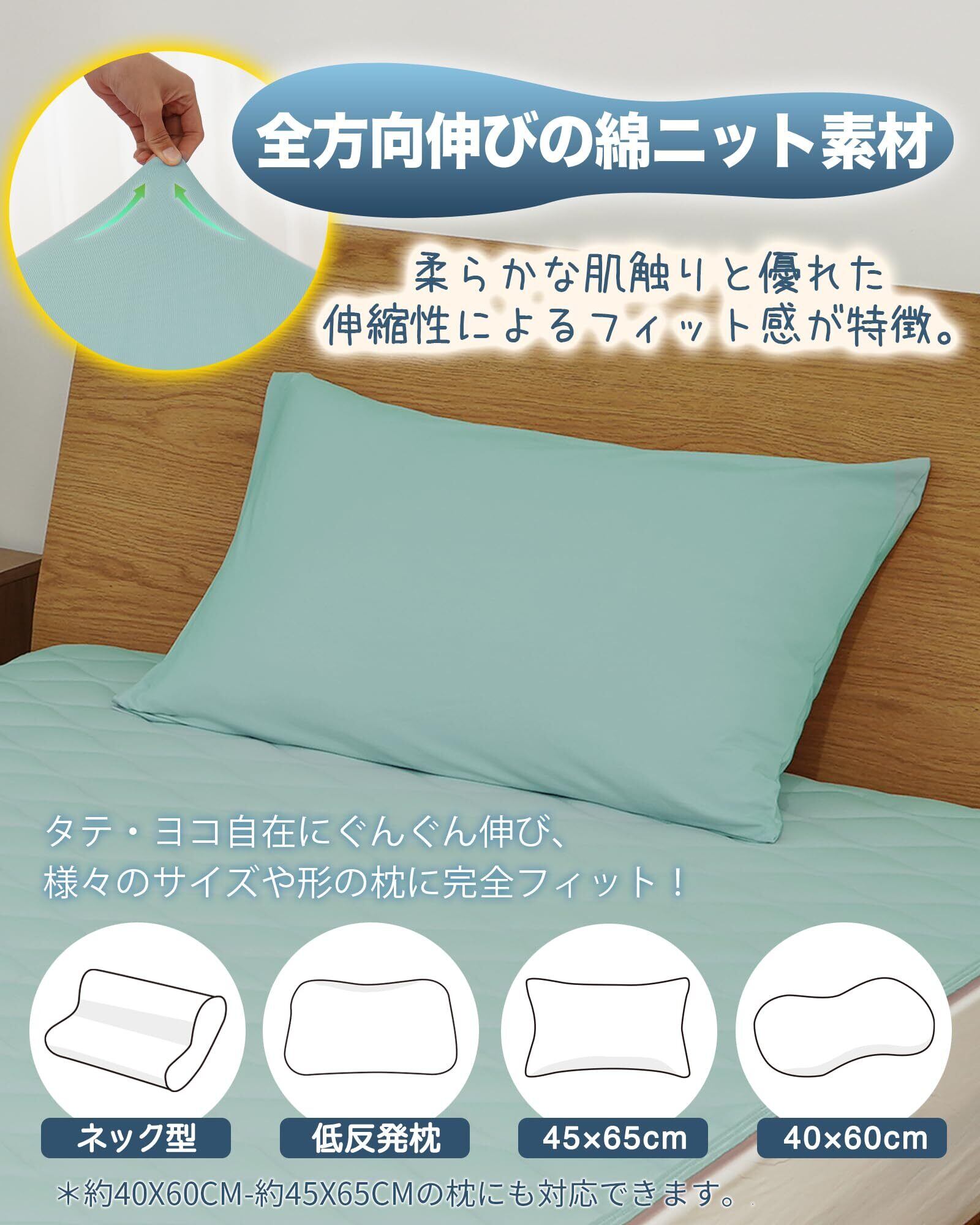 【のびのび・高級天然綿枕カバー 】のびのび枕カバー本体のサイズは43x63cmです。タテにもヨコにも伸びるので、40x60cm 43x63cmの枕に適用できます。高級綿95%とポリウレタン5%の組み合わせで、やわらかい肌触りと、優れた伸縮性によるフィット感を実現したのが特徴です。天然綿素材を厳選し、肌に優しい触り心地と通気性を実現しています。オールシーズンに対応するまくらカバーで、年間を通じて心地よい睡眠を提供します。