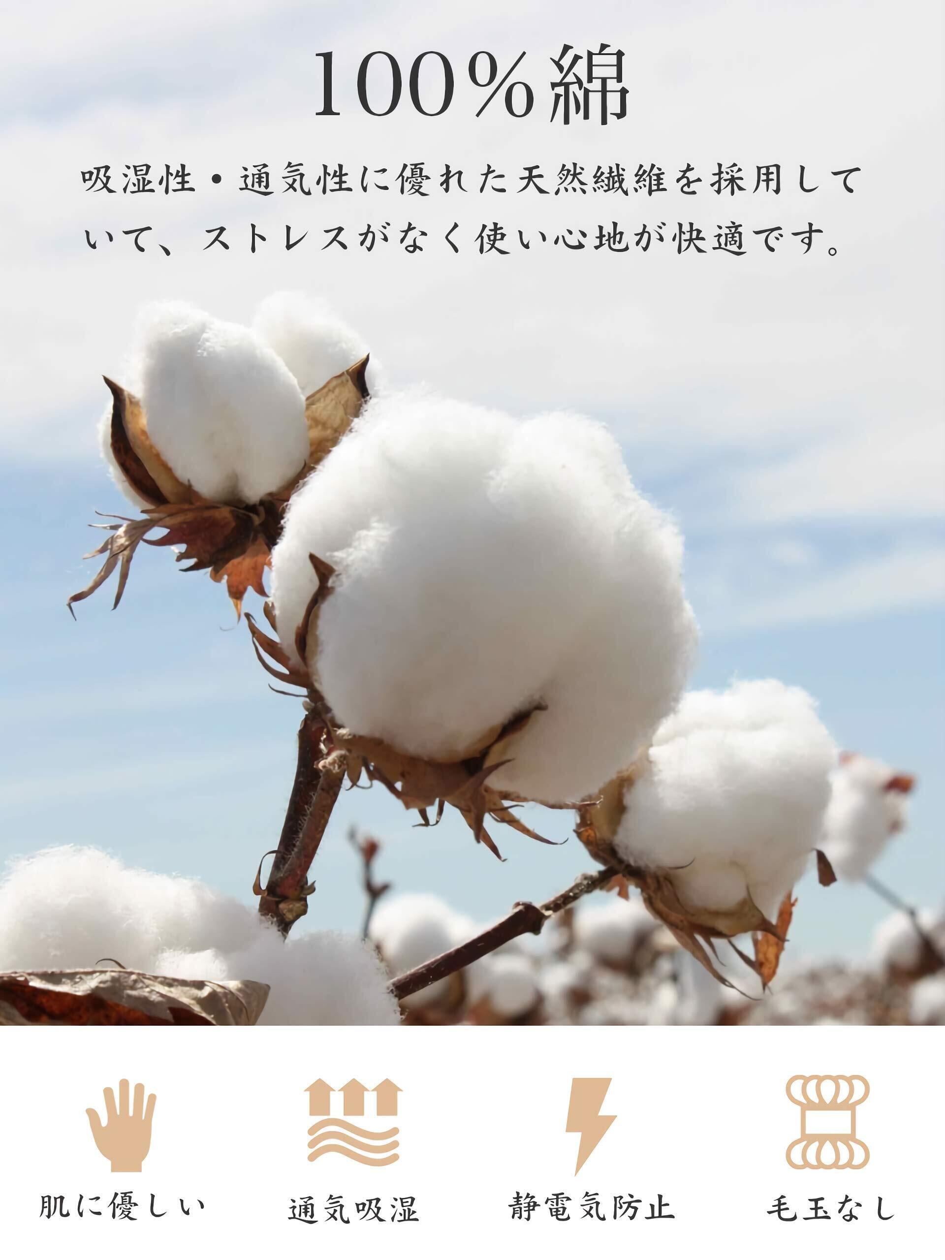 【素肌にやさしい天然繊維】綿は天然繊維ならではの自然な肌触りで、ストレスなく快適にお使いいただけます。化学繊維と違い、静電気が発生しにくく、不快感を感じることが少ない安心の素材です。コットン特有のさらりとした感触が、より快適な眠りへと導いてくれます。