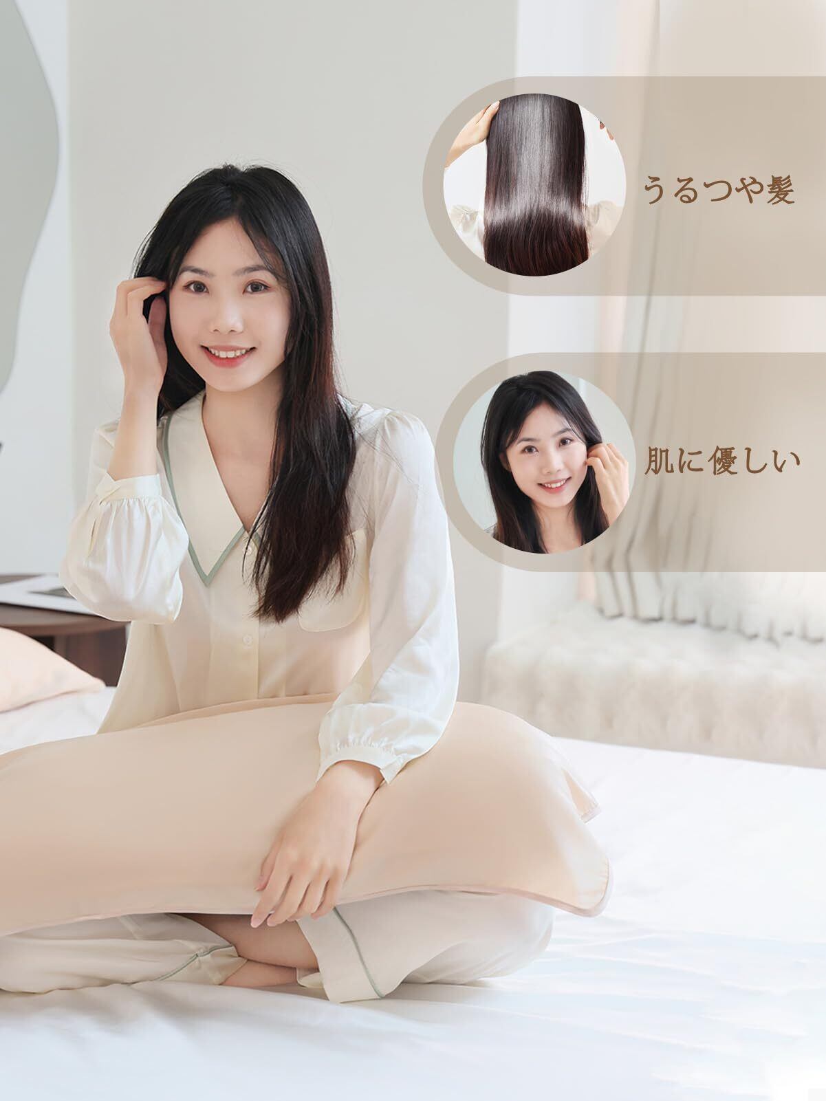 美髪・美肌:シルクは、摩擦を軽減し、肌に潤いを与える優れた素材として、近年美容界で注目を集めています。 シルクの表面は滑らかなので摩擦が起こりにくく、切れ毛・枝毛の悩みも改善できます。 シルクの枕カバーは純綿の枕カバーより通気性に優れています。肌の水分を調節し、肌に栄養を与えます。シルクも、ダニやカビの繁殖を防ぎ、皮膚アレルギーを防ぐことができます。綿と比較して、シルクの枕カバーが最適な選択です!