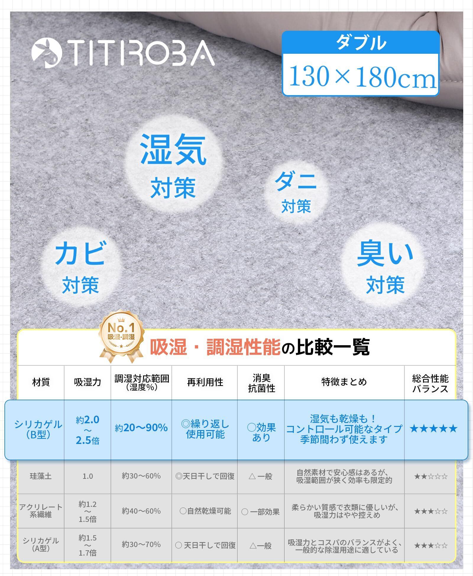 【吸湿・調湿NO.1の材質採用】チチロバ(TITIROBA) 除湿シート ダブル 除湿マット 防ダニ 防カビ 消臭 湿気対策 吸湿センサー付き 寝具用除湿シート 布団湿気取りシート 吸湿マット ベッド用 洗える 梅雨対策 130×180cm グレー DJ0006