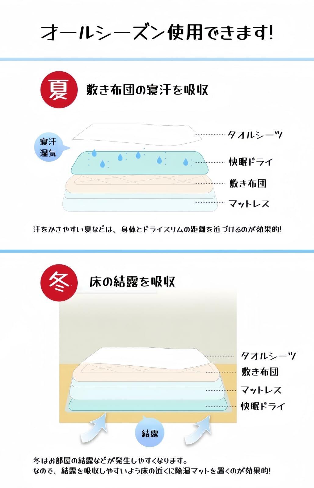 【ふとんの湿気をぐんぐん吸収する】フローリングの上に直接敷き布団を敷いた時、敷き布団の下の湿気が気になったことありませんか?敷くだけで湿気を強力吸収!ベッドでも床でも、敷き布団でもベッドマットレスでも、どちらでもご使用OK。敷き布団やベッドパッドの下に敷くだけで、ふとんの湿気をぐんぐん吸収して、効果抜群の便利アイテムです!