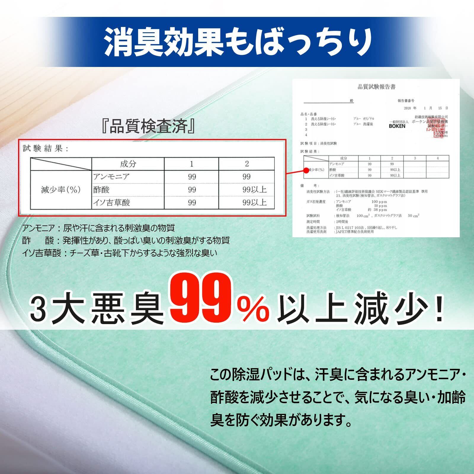 【3大悪臭99 %以上減少】国内公的検査機関の消臭性試験にて実証されています。この除湿パッドは、汗臭に含まれるアンモニア・酢酸を減少させることで、気になる臭い・加齢臭を防ぐ効果があります